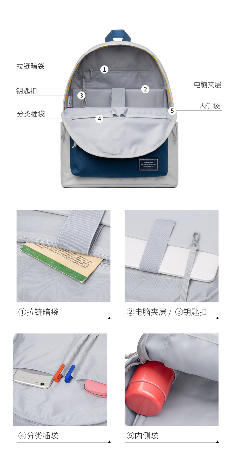 内部结构: 网袋 拉链暗袋 手机袋 证件袋 电脑插袋