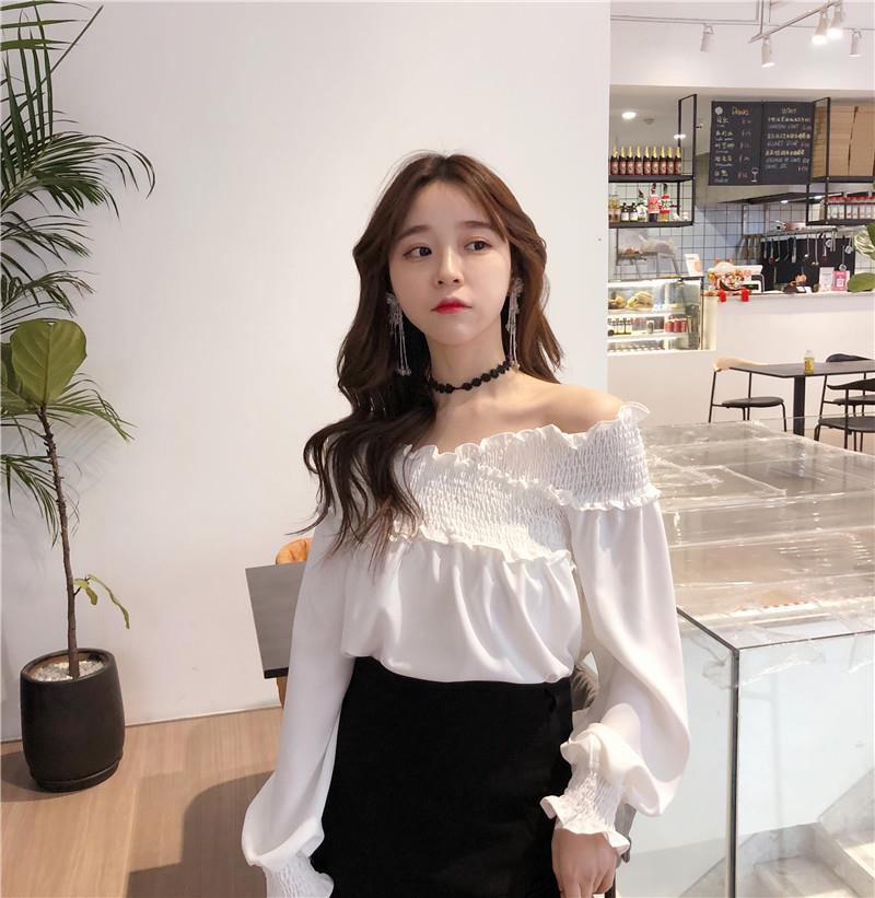 白色衬衫女2018春装新款韩范一字领露肩雪纺衫木耳荷叶边上衣服潮