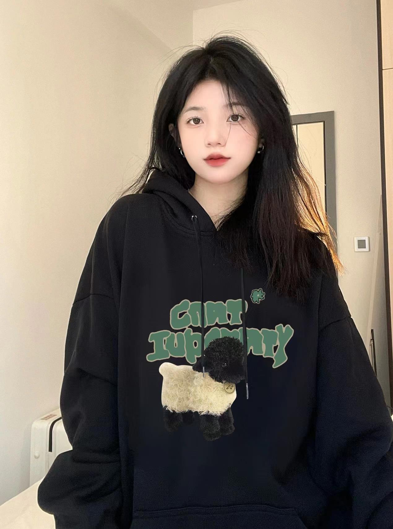 古着连帽加绒卫衣女冬季新款加厚宽松艺术生上衣