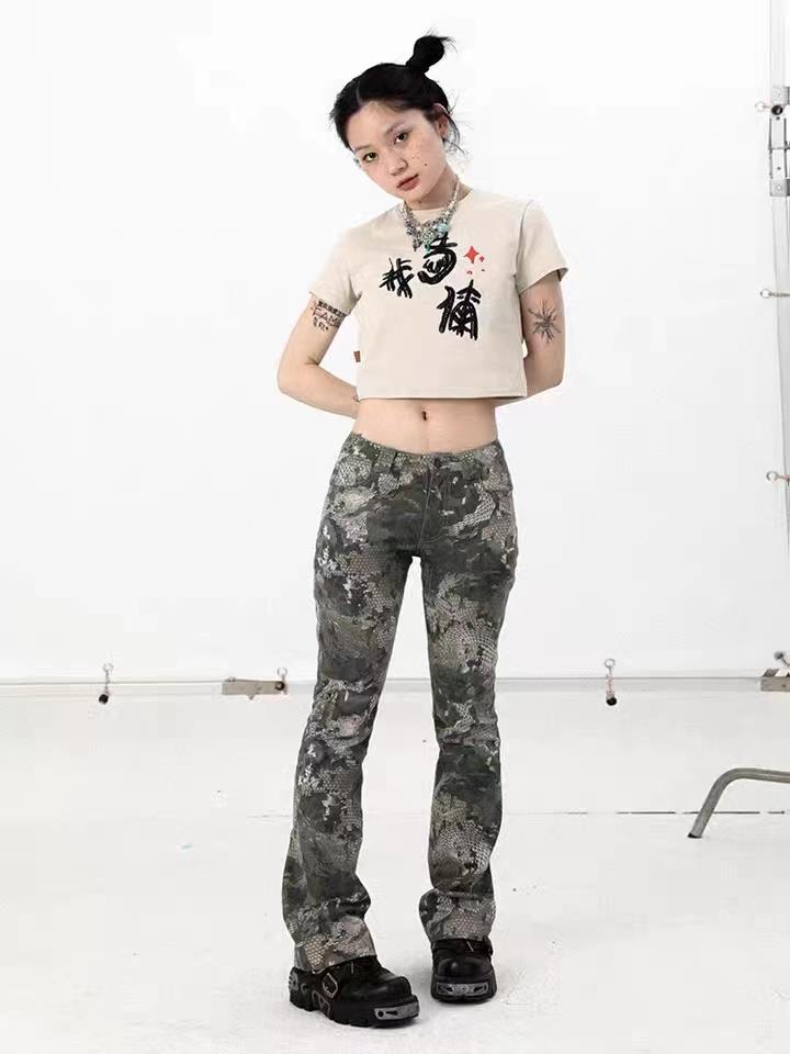 服饰箱包、运动户外 > 下装 > 迷彩微喇2022新款高街做旧牛仔长裤
