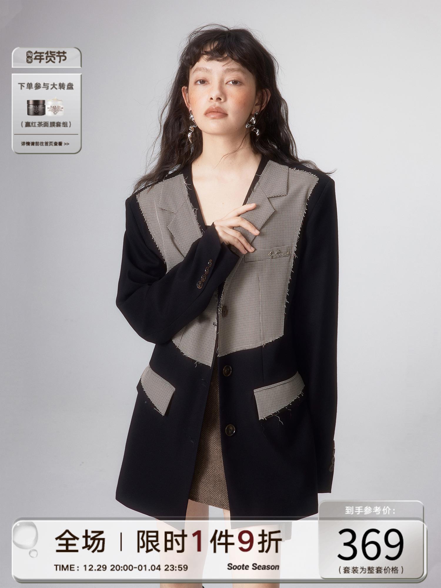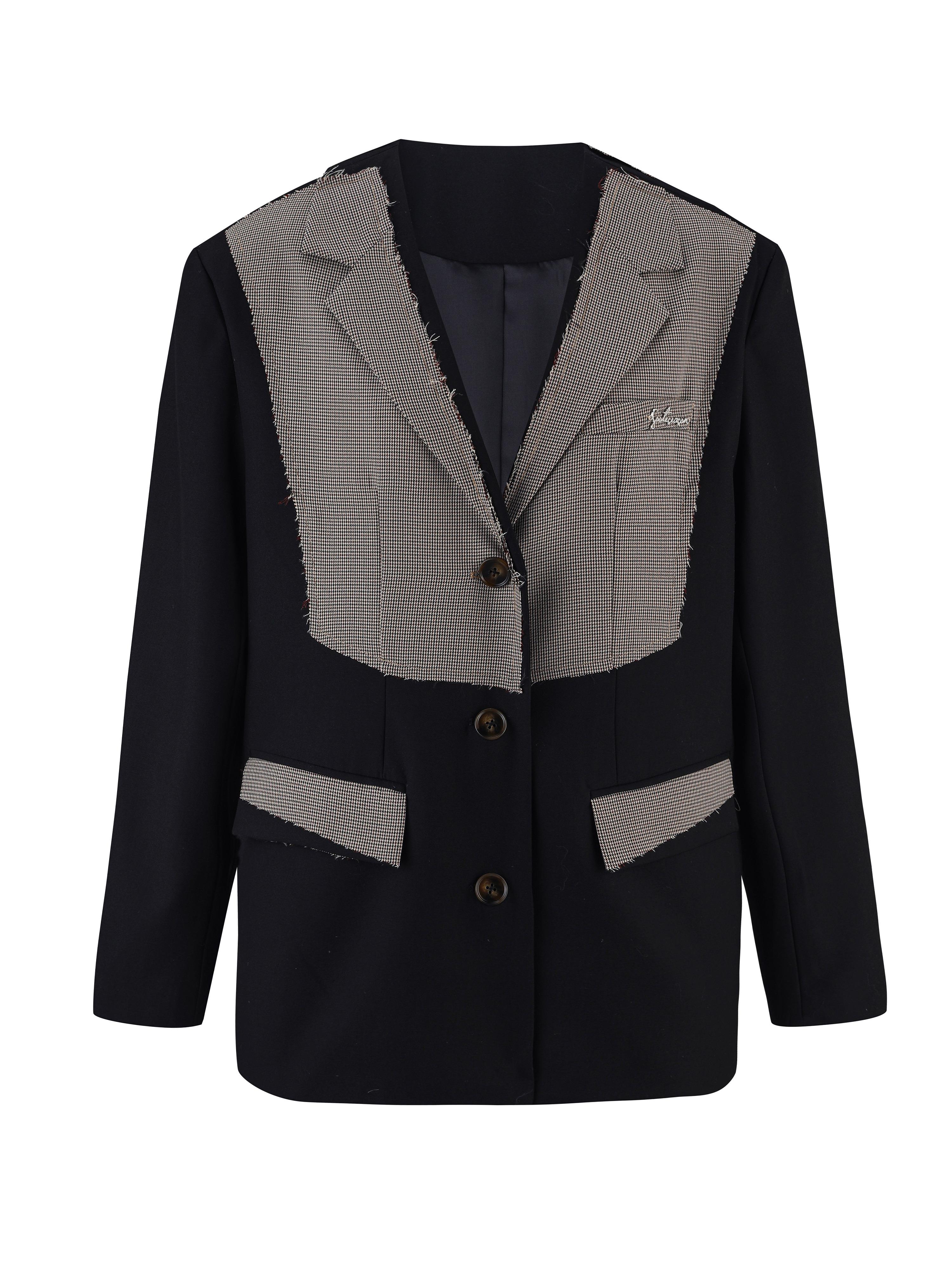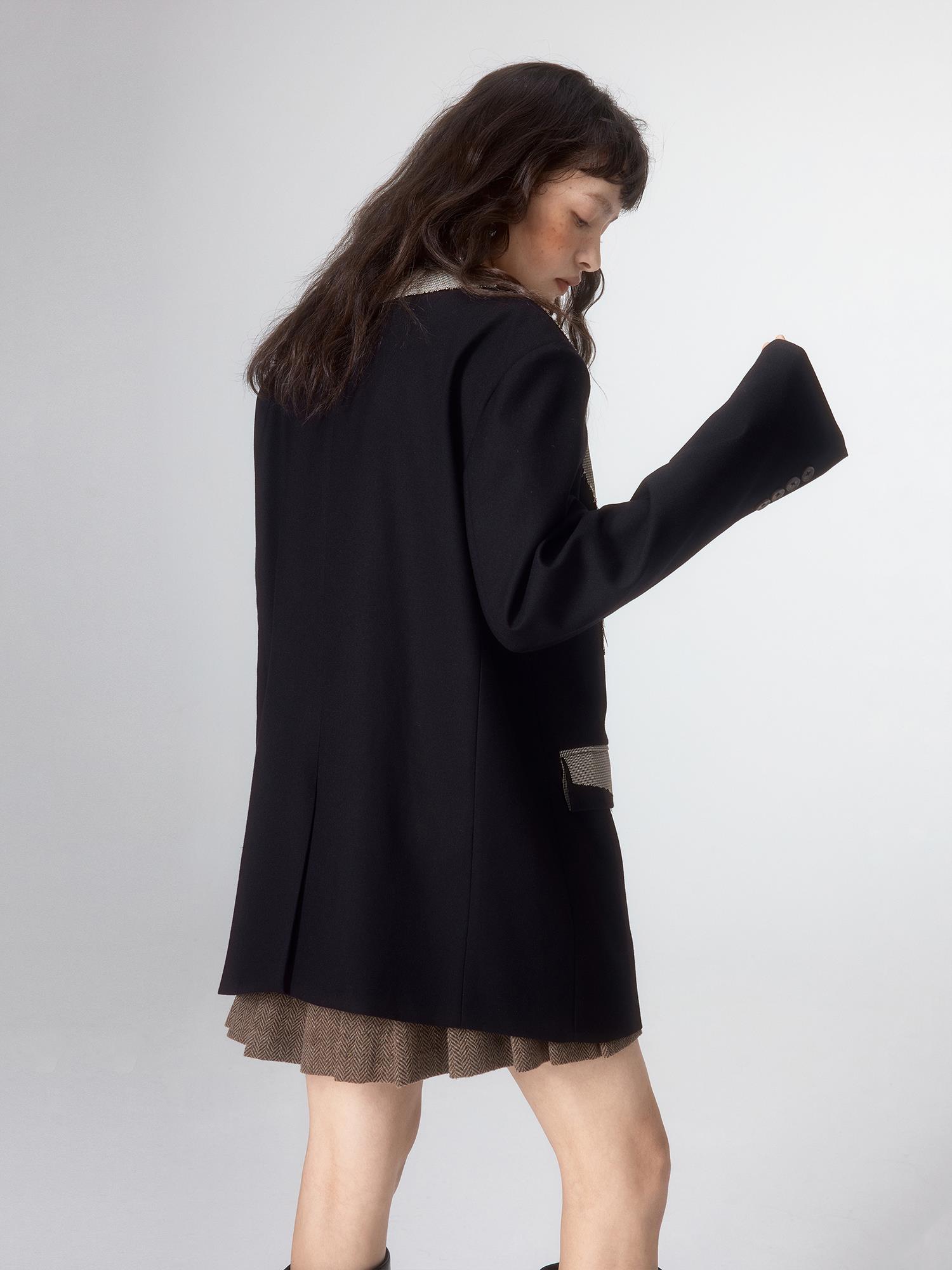 黑色西装料拼接棕咖色格纹面料,撞色设计,低调又别致;