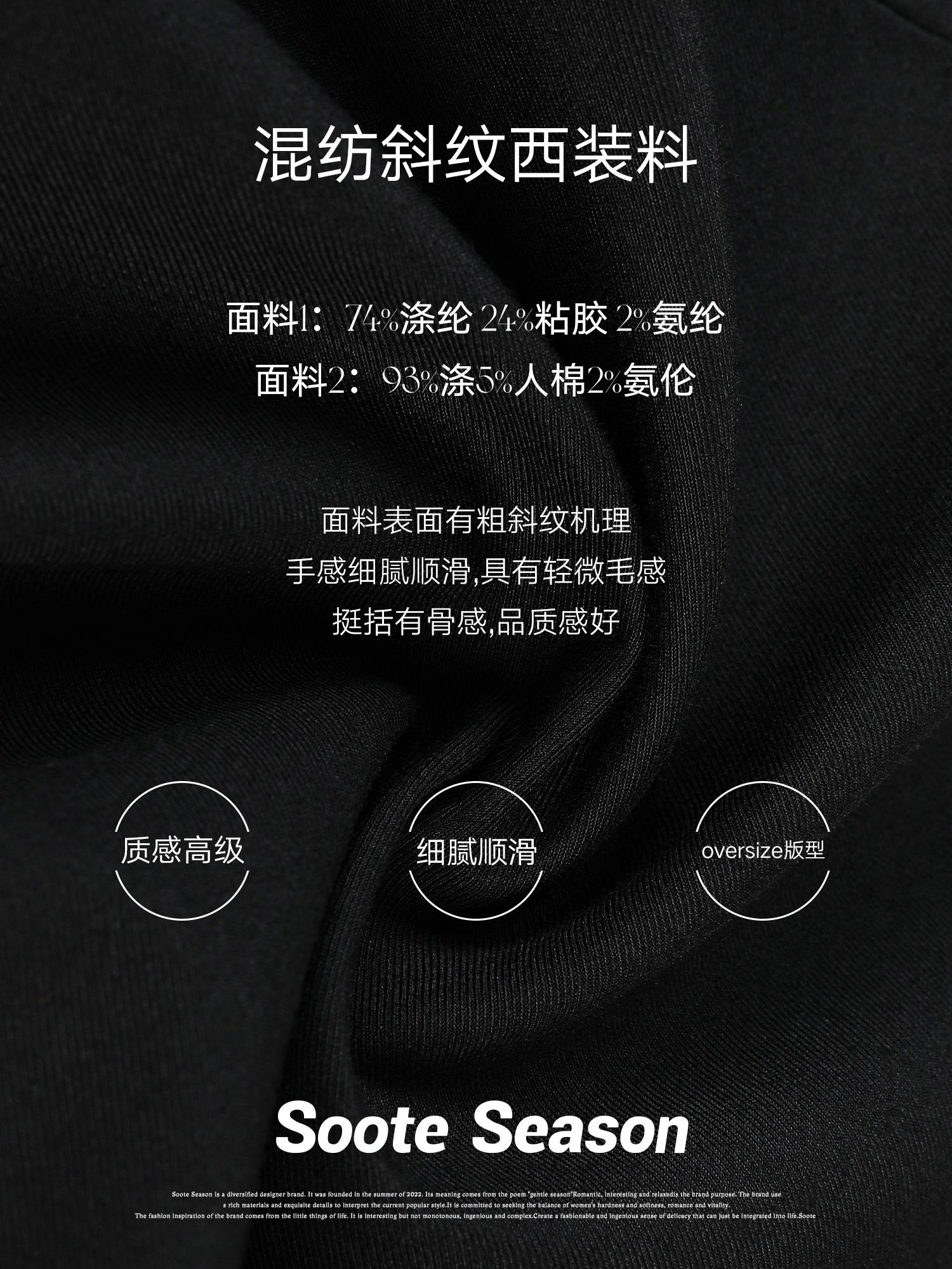 带有垫肩设计的男友风版型,宽肩挺阔,剪裁利落;偏大宽松版型,包容性强;