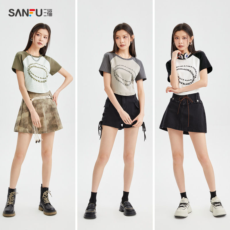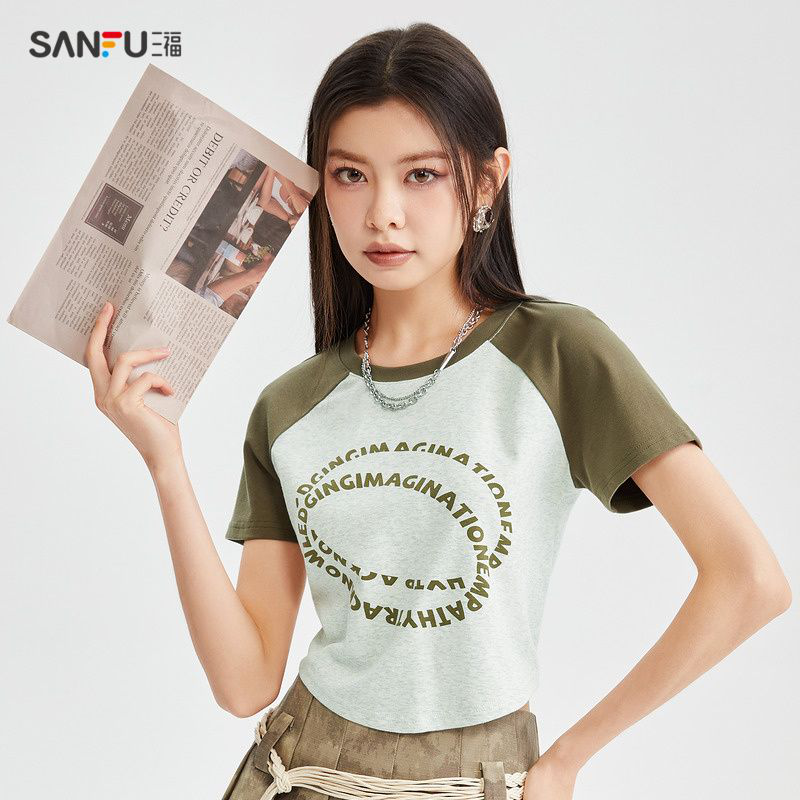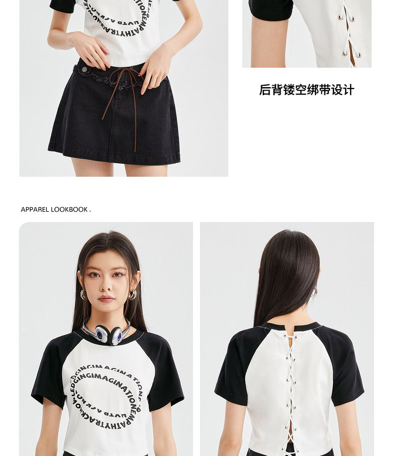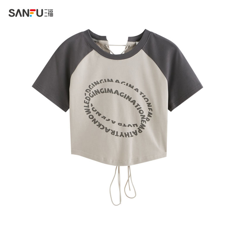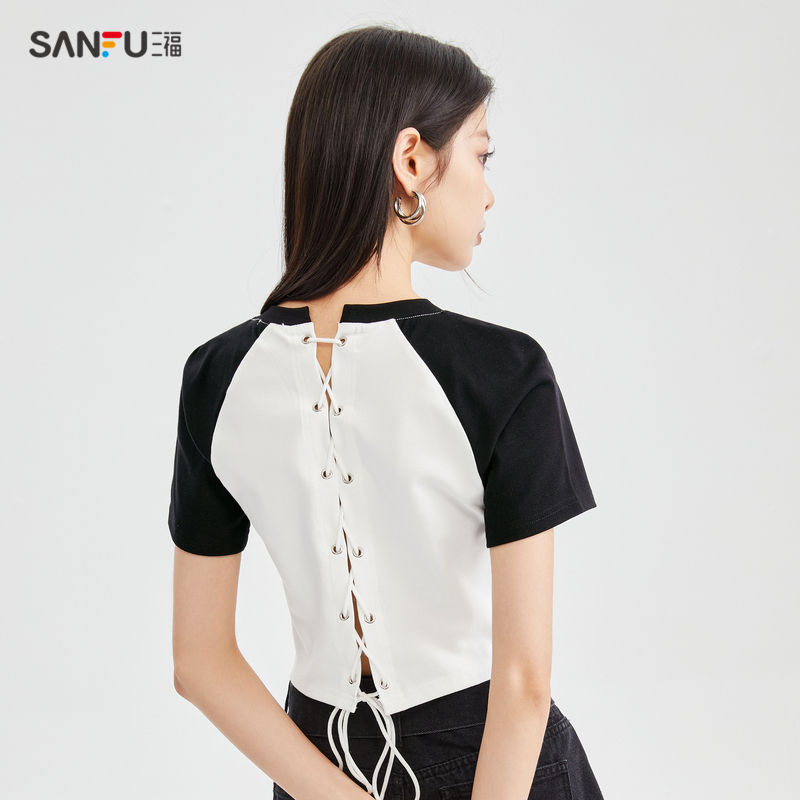 商品名称:三福短T恤2023夏后镂空绑带撞色插肩袖短款修身辣妹上衣469053 米白撞黑 165/88A/M