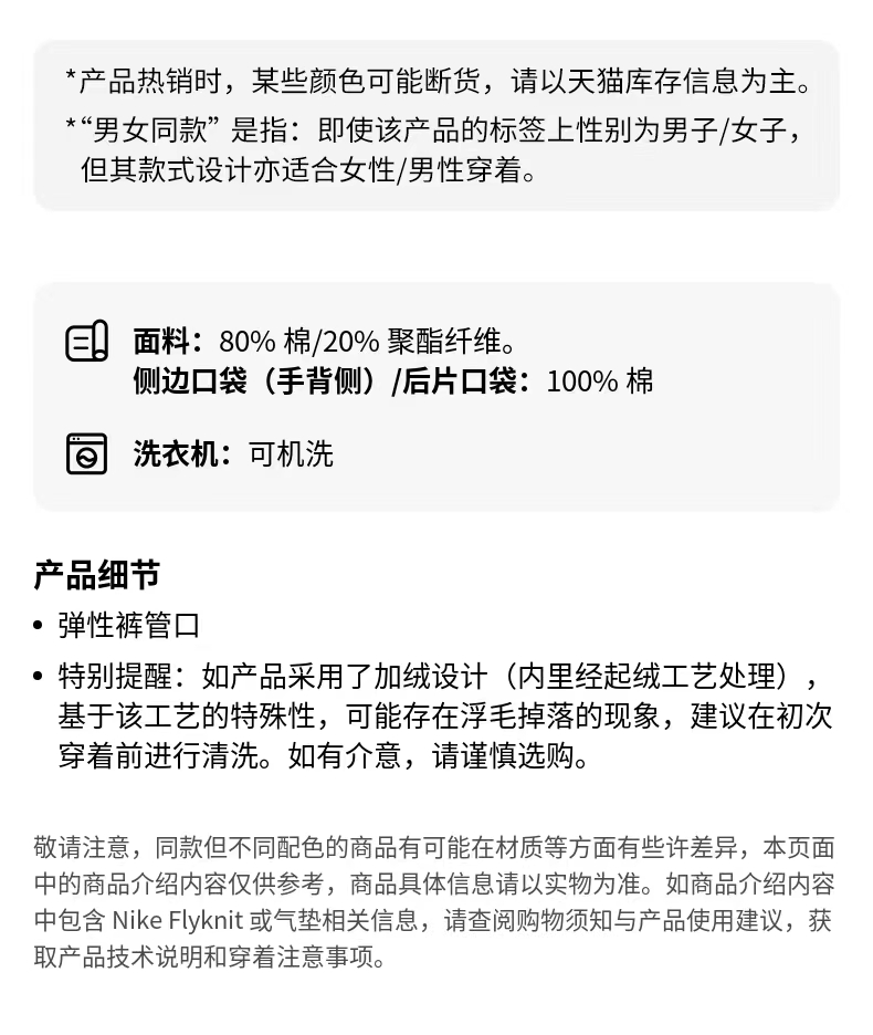 • 商品名称:Nike耐克官方男子加绒长裤...