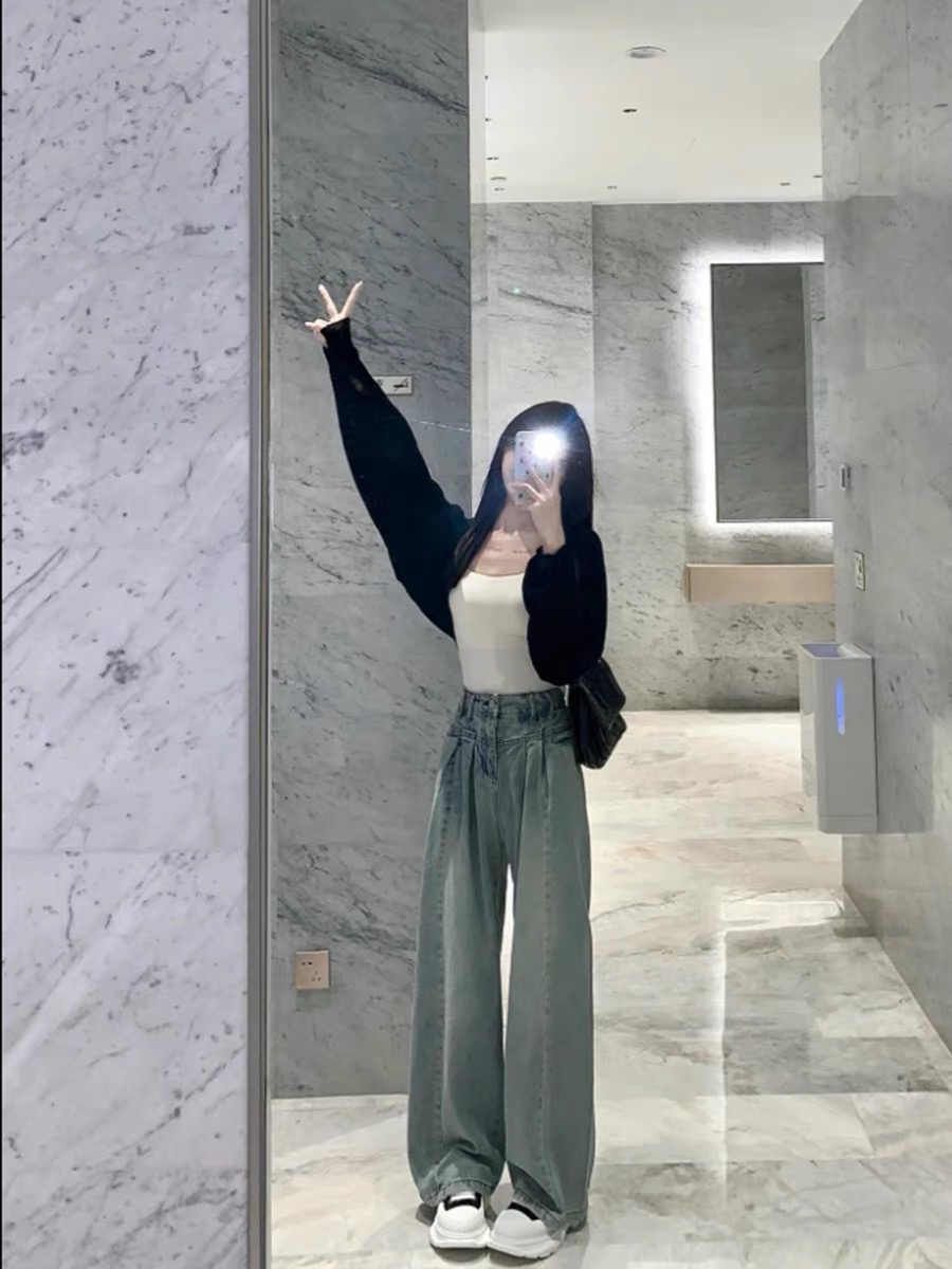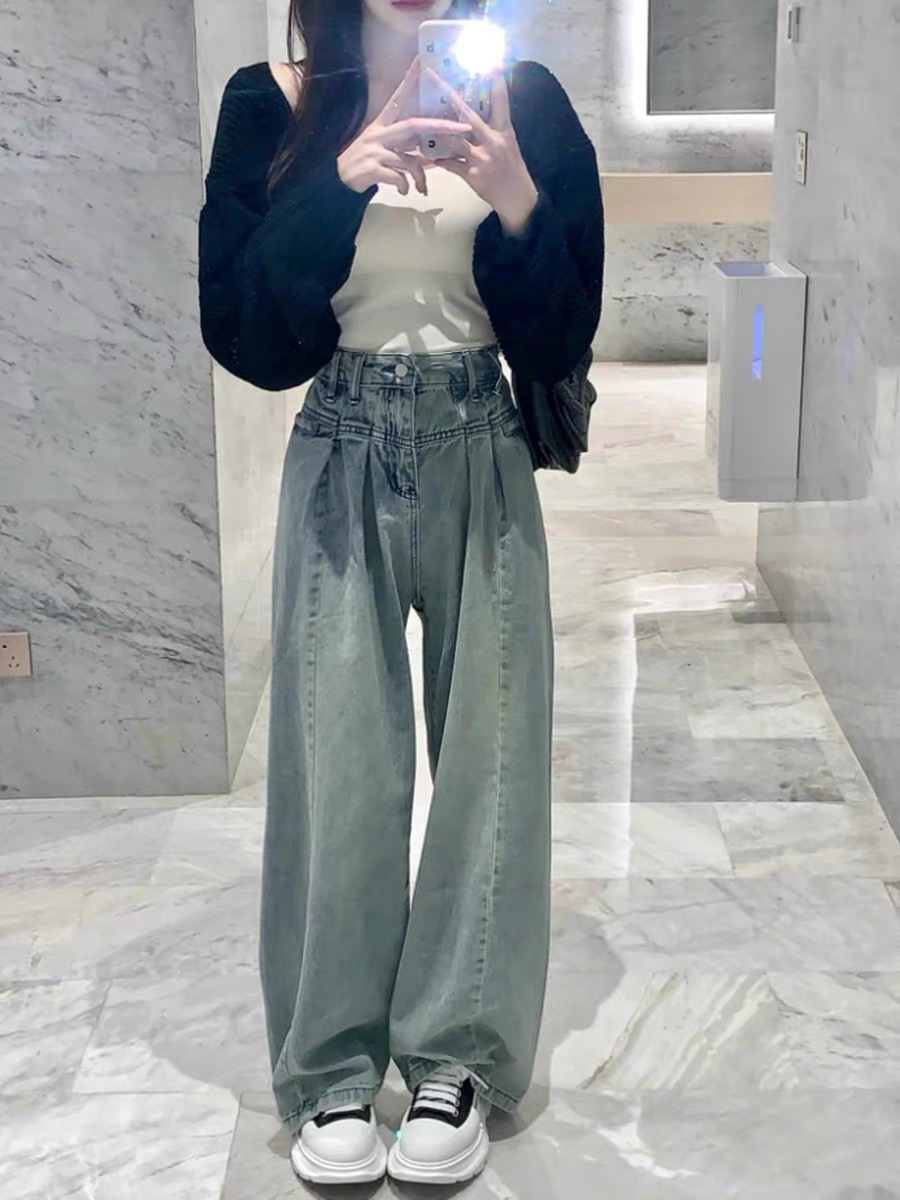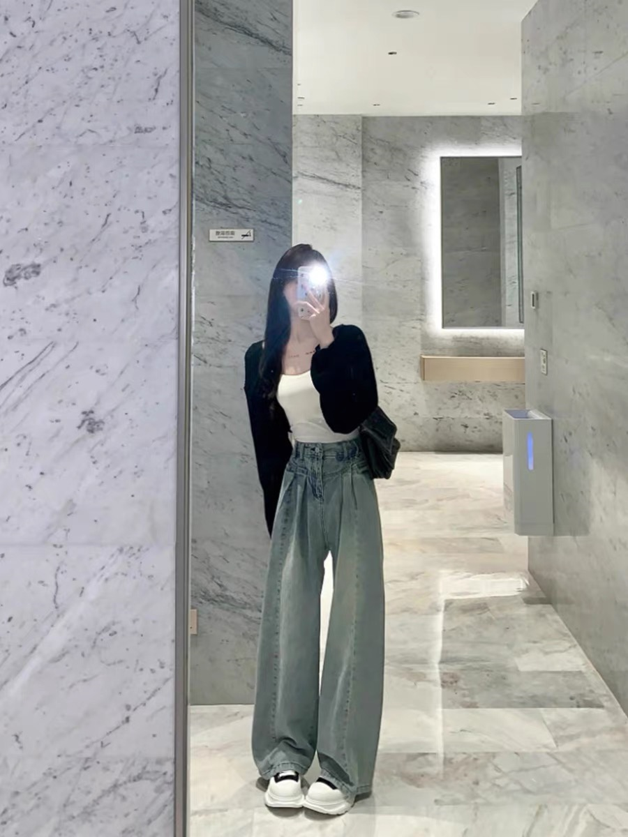 直筒牛仔裤秋季女高腰复古加绒宽松褶皱垂感阔腿拖地牛仔裤