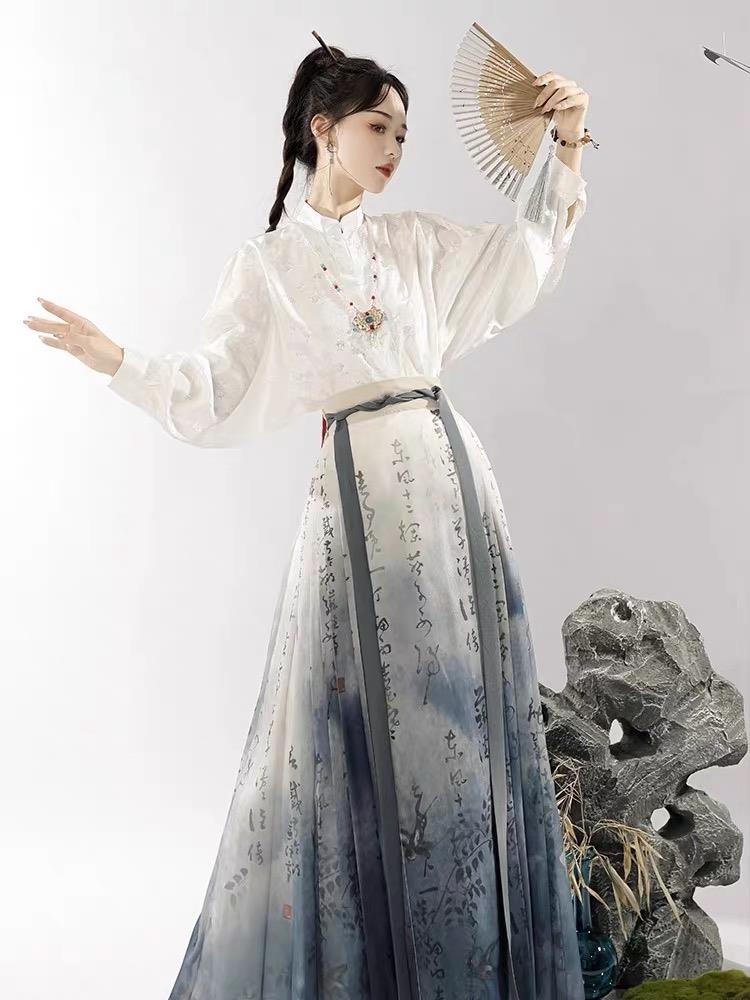 裙子采用水墨书法结合晕染印花,立领衬衣的搭配增添潇洒飒气的感觉