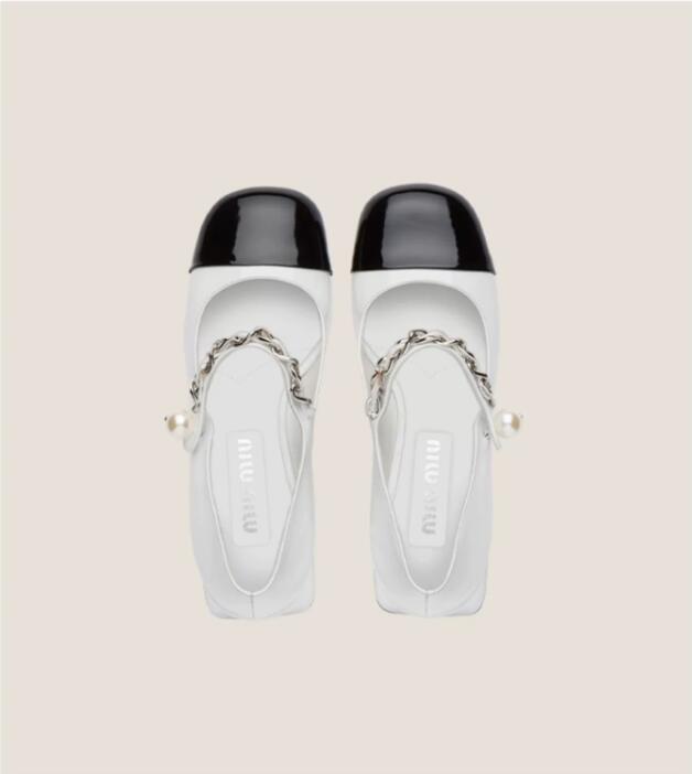 浪漫魅力弥漫于此款经典芭蕾平底鞋。仿水晶嵌饰对撞漆皮趾帽,闪耀熠熠光泽。标志性的Miu Miu仿珍珠点缀饰带,与金属带链条相搭,引人联想珠宝世界。