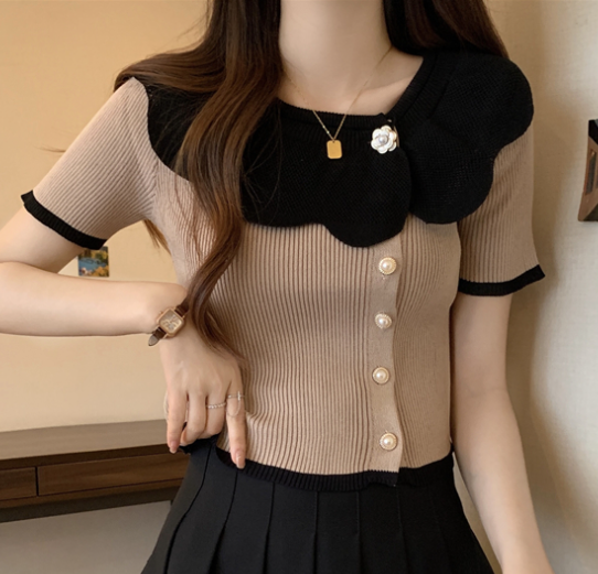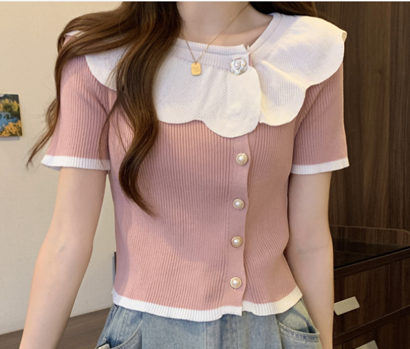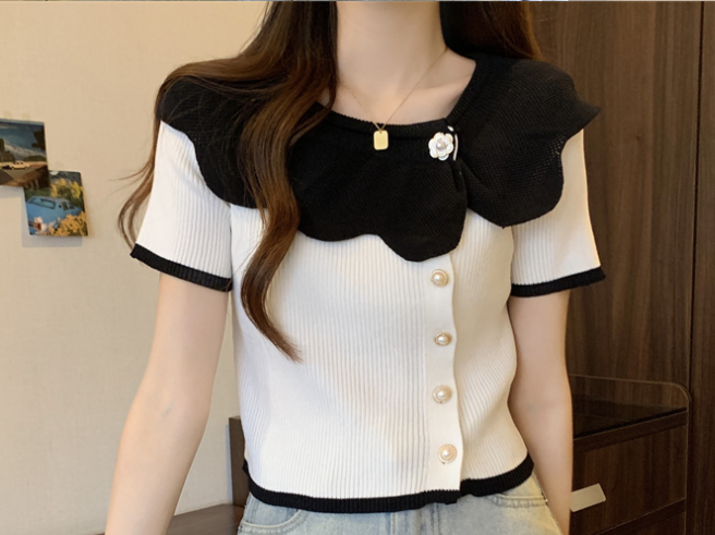 它采用的是冰丝材料,质地轻薄透气,非常适合夏季穿着。服装的版型设计为修身型,能够很好地修饰身材线条,展现出女性优雅的身形。短袖的设计更是增添了清爽的感觉,适合各种日常场合穿着。这款短袖T恤采用法式优雅的设计风格,娃娃领的设计不仅甜美可爱,还增添了一丝俏皮感。小个子女士穿上后,能够很好地展现出身材的娇小玲珑,同时又不失时尚感。从细节上看,这款T恤的领口设计具有一定的开口,能够露出迷人的锁骨,增加了一分性感的气息。同时,领口的松紧程度适中,既能保证舒适度,也能避免过于紧绷的束缚感。袖子的长度为短袖,可以有效地遮挡住手臂上的肉肉,对于追求美观的女性来说是一个不错的选择。