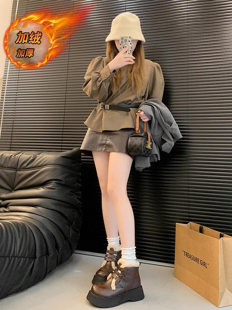 靴筒内里材质: 人造短毛绒靴筒面材质: PU帮面材质: PU鞋面内里材质: 人造短毛绒靴款品名: 雪地靴筒高: 高筒鞋头款式: 圆头后跟高: 平跟跟底款式: 平跟是否库存:是