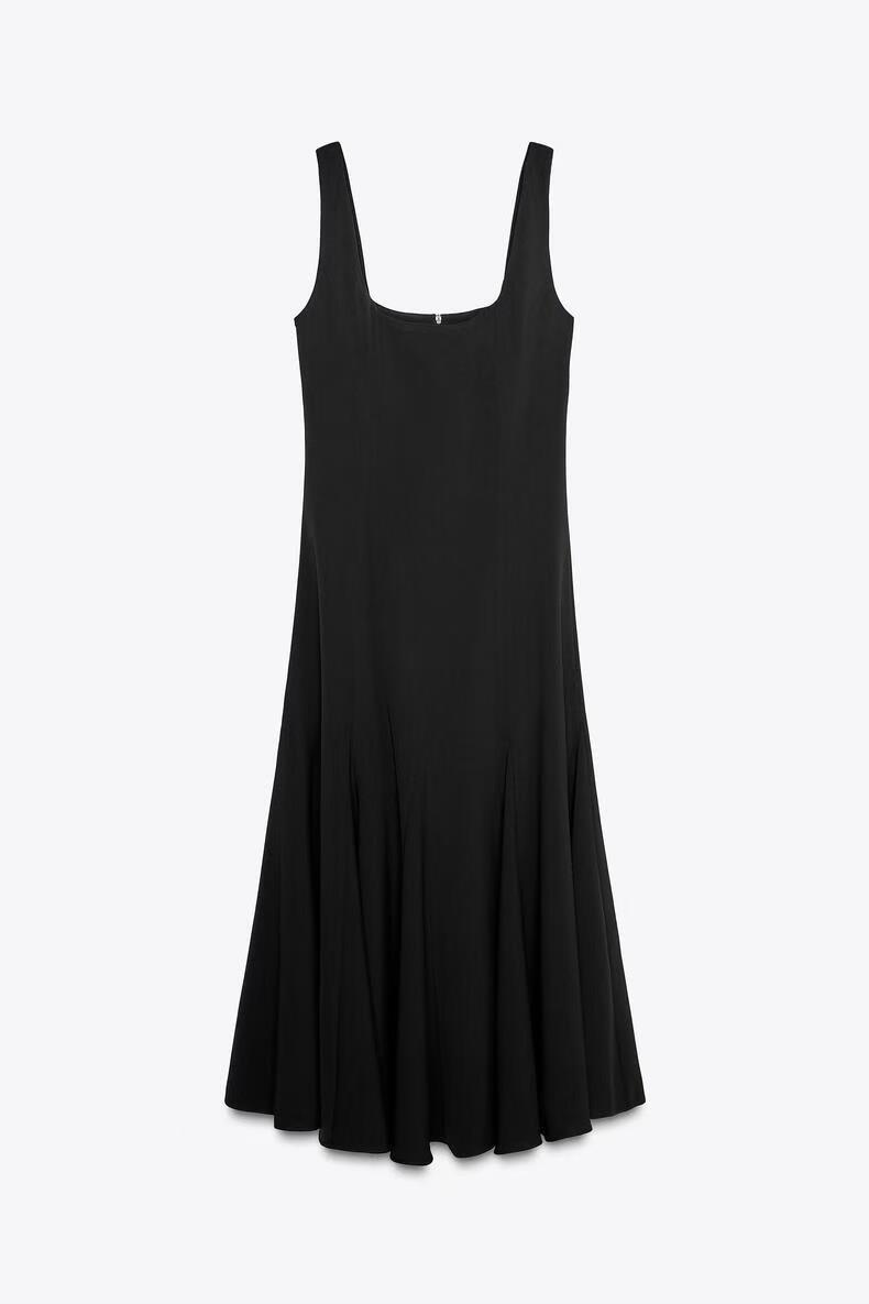 宽肩带方领迷笛连衣裙。宽摆裙摆。背面拼缝处暗拉链闭合。
