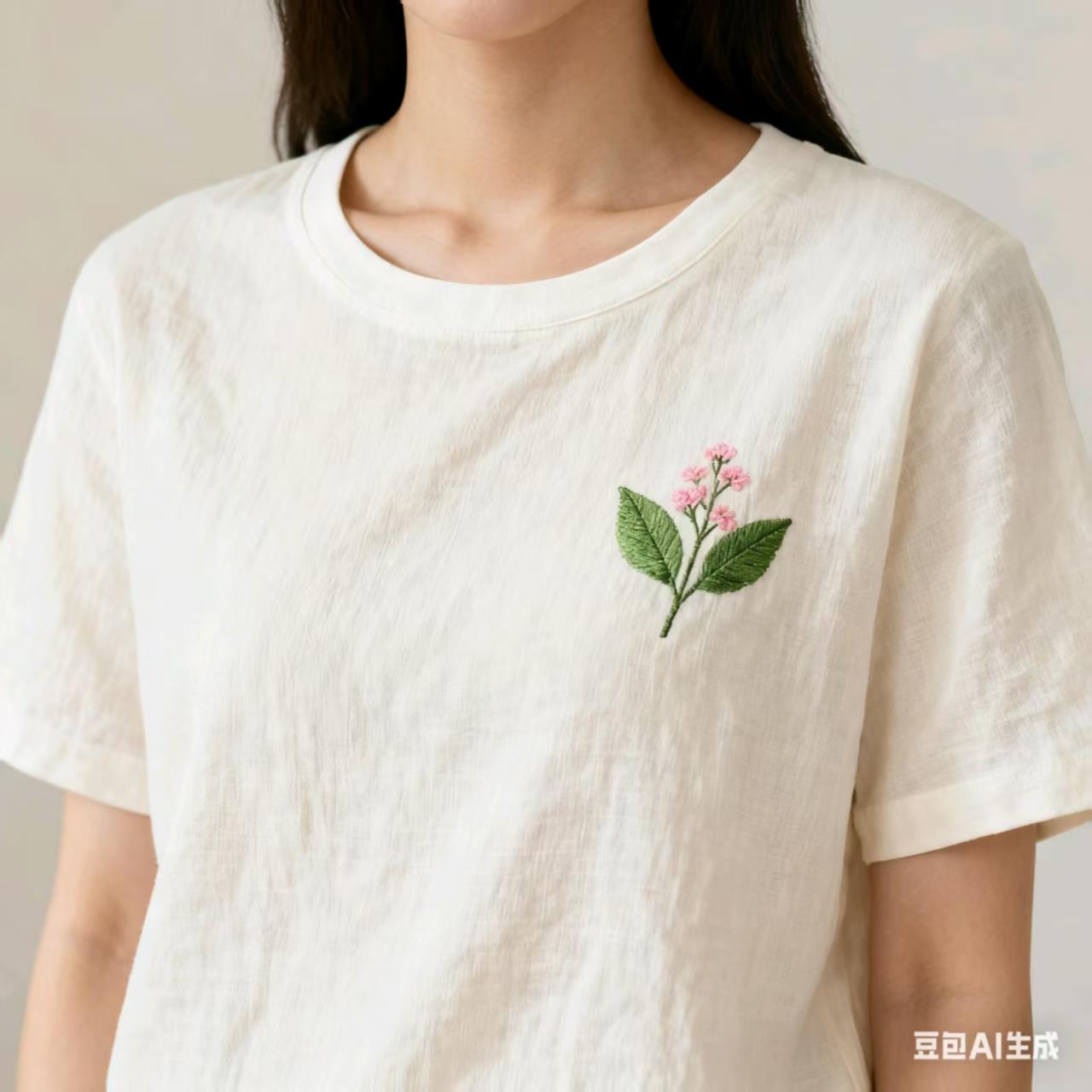 左胸处的植物刺绣,是整件T恤的灵魂所在。由10年以上经验的刺绣师傅手工操刀,选用进口环保色纺绣线,色彩饱和度低却质感十足:粉色小花的绣线,融合了浅粉与肉粉的色调,如同清晨带着露珠的花苞,娇嫩又柔和;翠绿叶片的绣线,是经过多次调色的自然草木绿,鲜活又充满生机。刺绣针法采用法式结粒绣+平针绣结合,小花的花瓣用结粒绣打造出立体饱满的质感,叶片则用平针绣细腻地勾勒出脉络纹理,每一针每一线都饱含着对自然的细致观察与艺术化呈现,让静态的图案仿佛拥有了随风轻颤的动态美感。