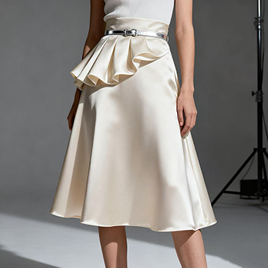 米白色缎面半身裙,采用高光泽感缎面面料,垂坠感佳且质感高级;收腰设计+A字裙摆修饰身形,单侧荷叶边装饰增添优雅氛围,搭配腰带更显腰线;适配约会、轻晚宴等场合,可搭配吊带、衬衫等多种上衣。