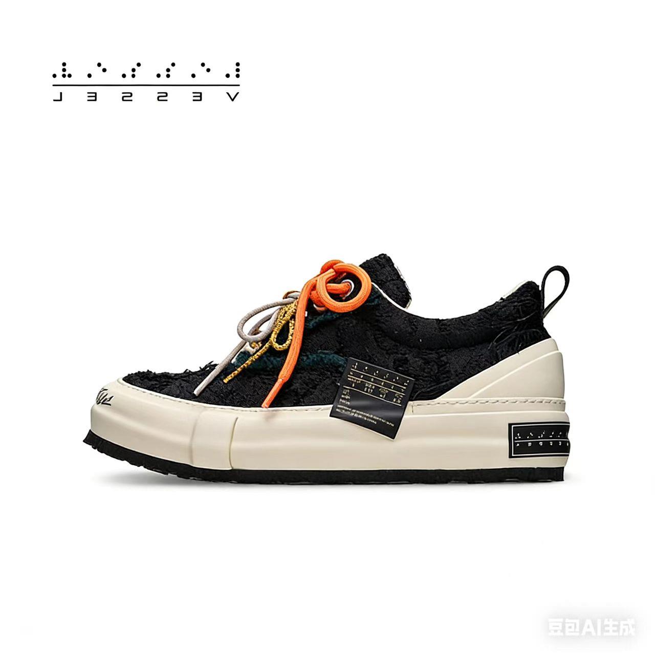 鞋面采用黑白配色,以解构设计为核心,有抽鬚破坏、草寫字母等元素,搭配厚底,展现出街头休闲风格。鞋帮为低筒,采用系带闭合方式,适合四季穿着。