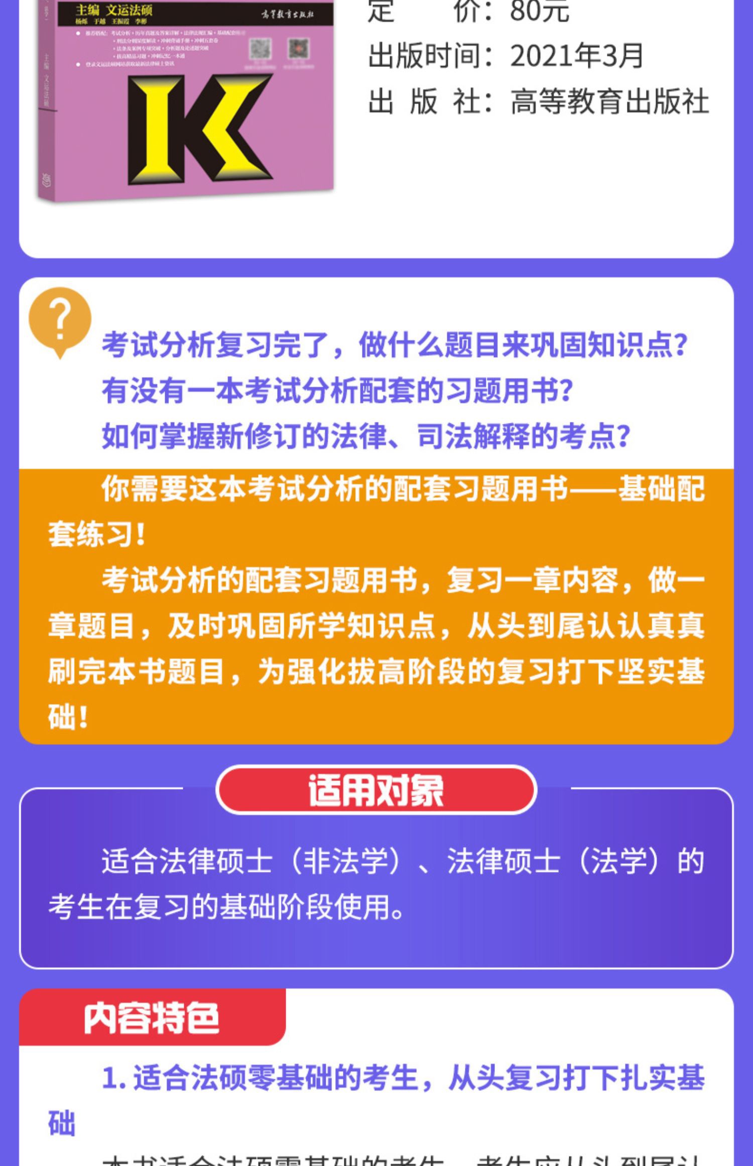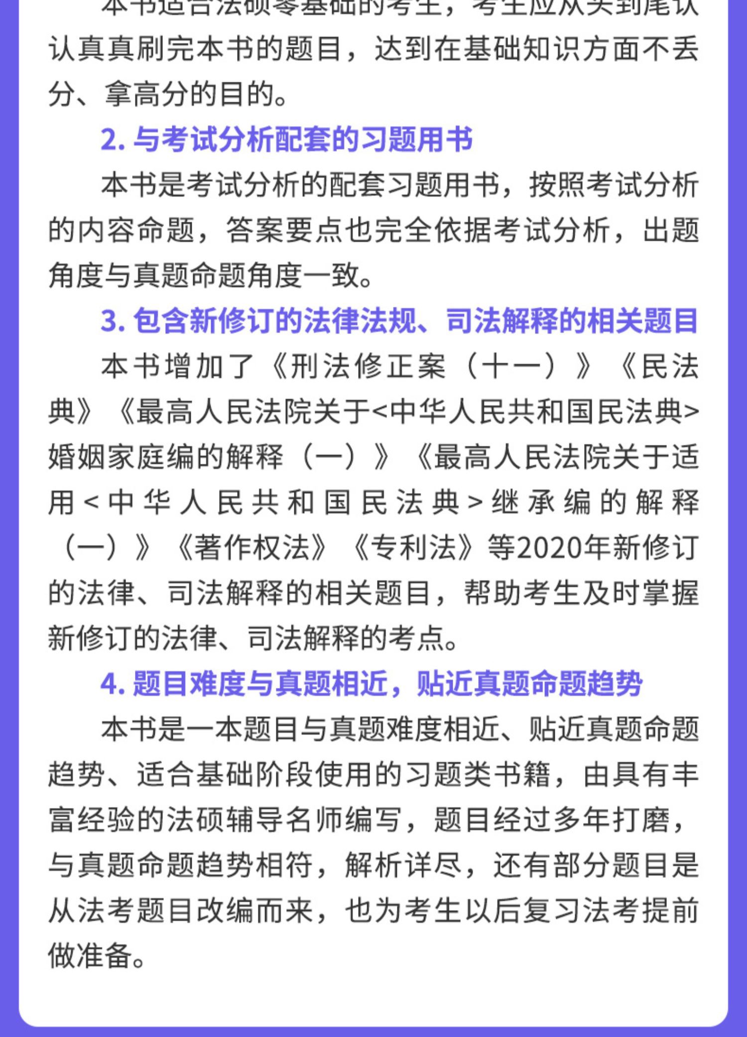 本书适合法硕零基础考生在强化阶段使用,考生对知识点已经有了一定的认识,接下来在复习的第二阶段刷完这本书的真题,达到强化巩固知识点,提高自身水平的目的。本书将2008年至2021年的14年真题按照背后的考点分类编写。