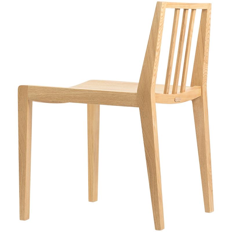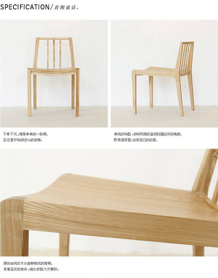 不卑不亢,简简单单的一张椅。简单的构型,却将利落的直线刻画出优美的角度。即使是背面,也有自己的态度。通体由实木水曲柳构成的简椅。有着坚实的身体,细长纹路大方雅致。独特工艺让简椅不动如山,内扣的线条让腿部纤长细巧。微微下凹的曲线之后,是更为舒适的坐感体验。