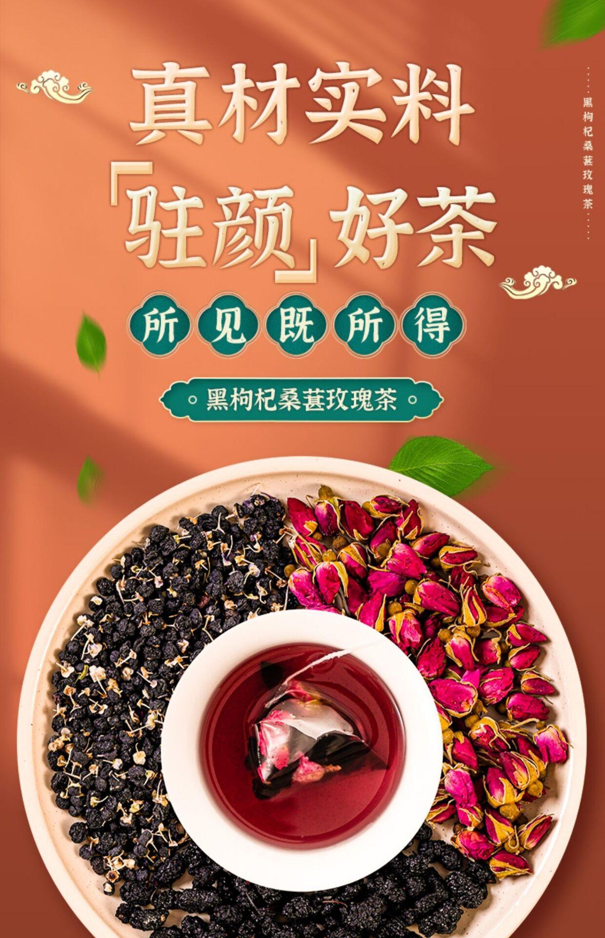 桑葚枸杞菊花茶是黑枸杞干养生茶包草茶叶组合女颜美容泡水喝的。其配料有:黑果枸杞、桑葚、玫瑰。真材实料,驻颜好茶,所见既所得。每一份都是精挑细选,足料营养高,耐泡耐喝,干燥不结块、泡水清亮、回味甘醇、细嗅清香。自然新鲜,好料出好茶。关爱身体,从喝茶开始。沙袋三角包,营养释放充足!