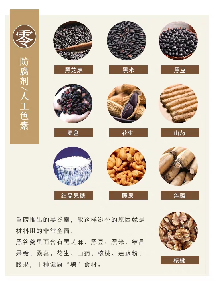 十款原料精细配比,十种黑色食材,无防腐剂、无添加剂、无增稠剂、我们拒绝麦芽糊精、香精等添加,想让你们吃到的就是食物本身的味道。