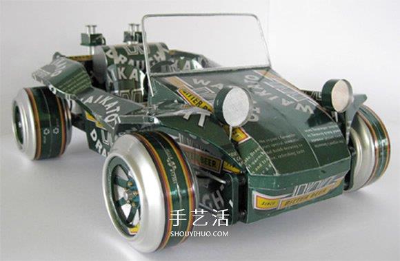 利用收集起来的易拉罐制造出汽车零部件,只有支架和风挡等部位使用其他材料,再装配成各种各样的的汽车,包括经典老爷车、赛车与吉普车等。
