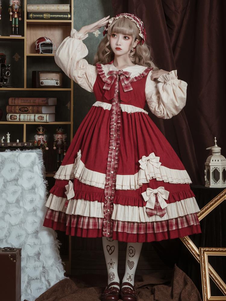 原创小红帽的篮子lolita新年红洛丽塔可爱蝴蝶结少女OP长袖连衣裙
