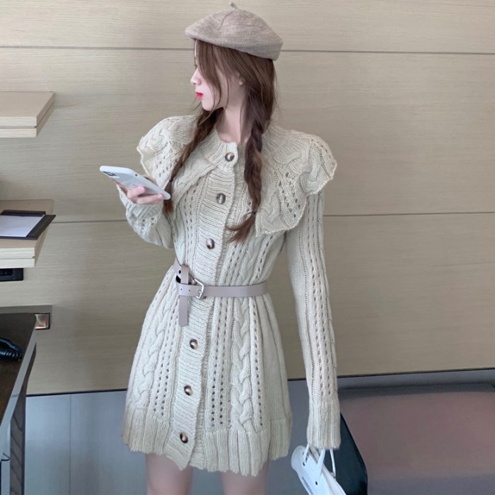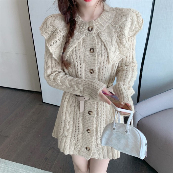心机镂空针织衫女2020秋冬季新款韩版翻领拼接荷叶边收腰长袖毛衣