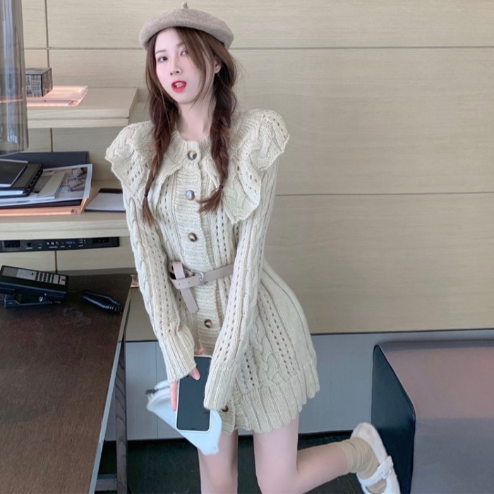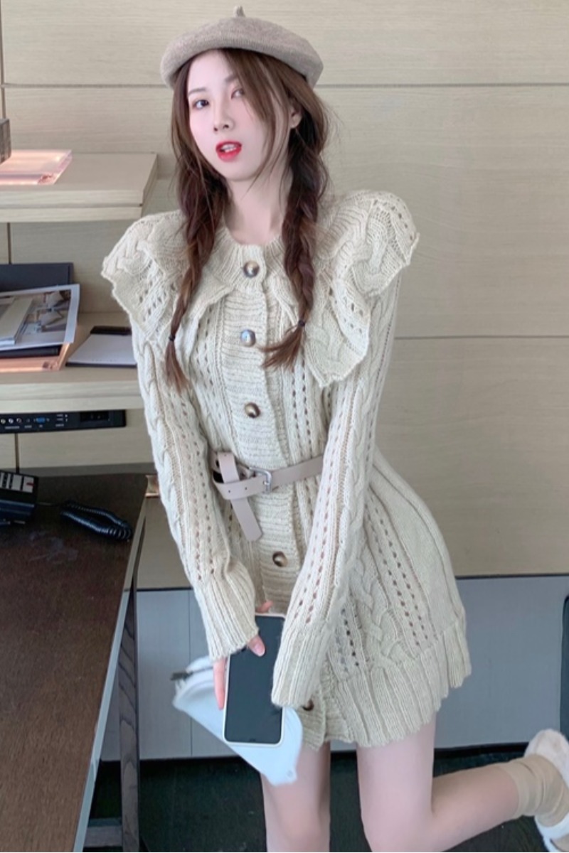 动漫周边 > 服饰 > 心机镂空针织衫女2020秋冬季新款韩版翻领拼接荷叶边收腰长袖毛衣