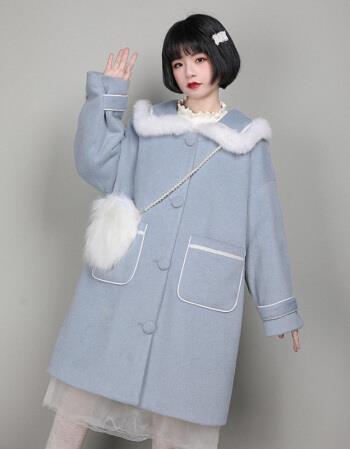 动漫周边 > 服饰 > 【冬尚新】品质优质小葱良裁设计学院风海军领毛呢大衣女大口袋夹棉中长款厚外套 天蓝色