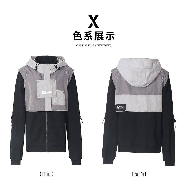 TWOEX2潮牌夹克个性套头衫长袖宽松舒适纯色连帽时尚拼接派克服