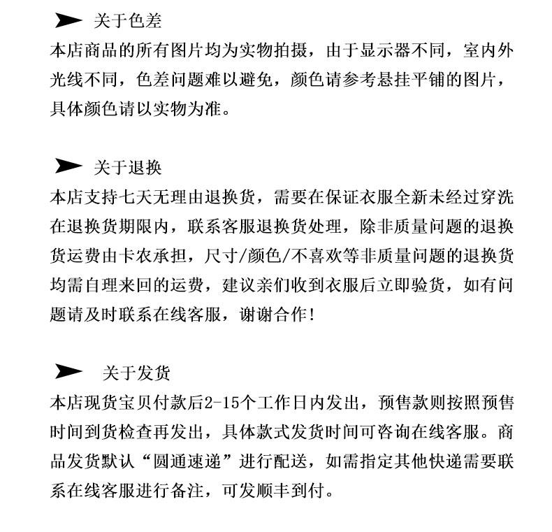 本店支持七天无理由退换货,需要在保证衣服全新未经过穿洗 在退换货期限内,联系客服退换货处理,除非质量问题的退换货运费由卡农承担,尺寸/颜色/不喜欢等非质量问题的退换货均需自理来回的运费,建议亲们收到衣服后立即验货,如有问题请及时联系在线客服,谢谢合作'