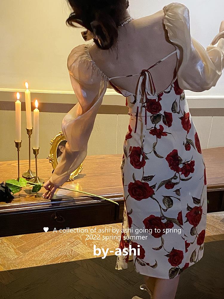 裙身布满了大气的杏底玫瑰花卉图案