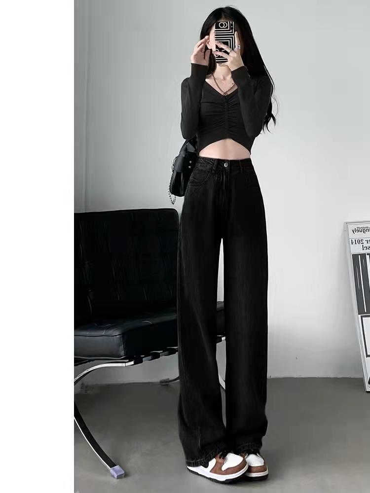 商品名称:佐马仕 高腰阔腿直筒加绒高腰牛仔裤女秋冬裤子冬季女小个子秋冬季新款宽松保暖加绒拖地裤子女装 黑灰色【长裤-加绒】 M(100-110斤)