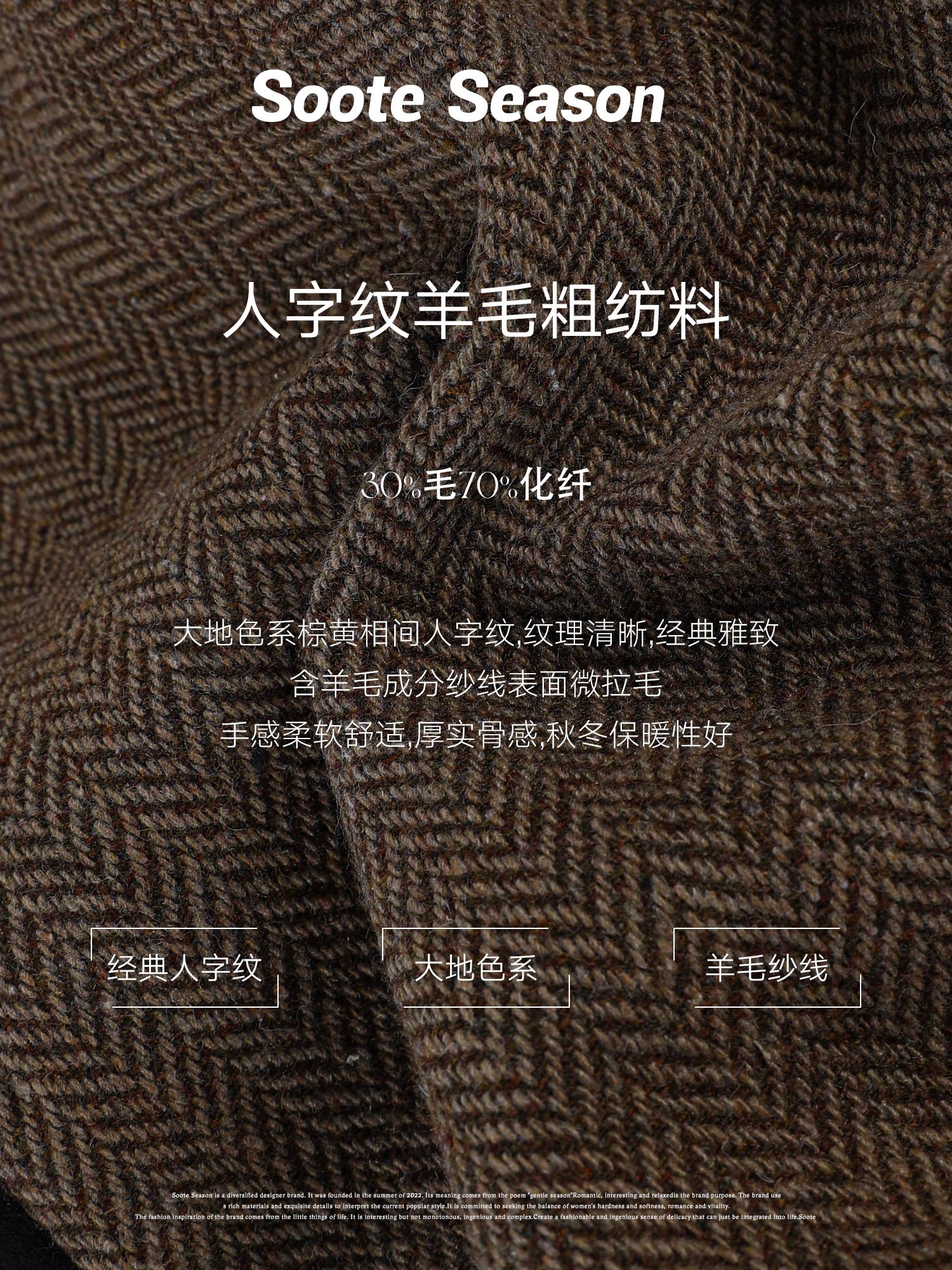 采用棕色细腻人字纹毛呢面料,复古韵味十足;成分含羊毛更具保暖性,兼具实用性和时髦感;整件衣服做复合工艺,使衣身更挺阔利落;