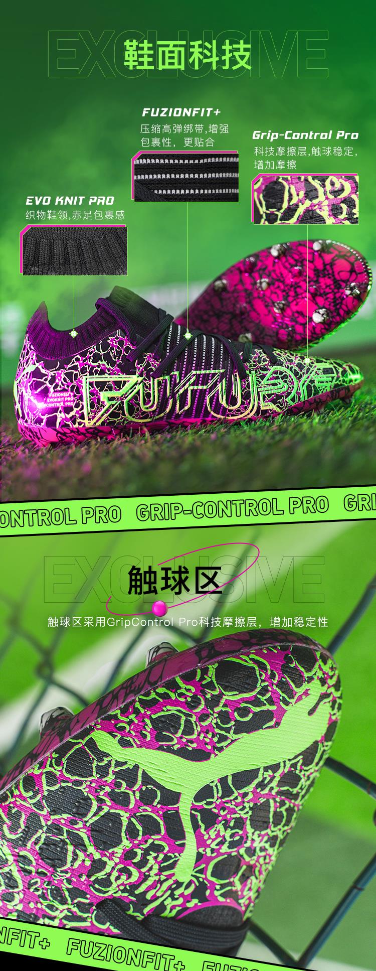 全新 FUTURE ULTIMATE 战靴将继续为拥有极致创造力且特立独行的球员保驾护航。在全新技术的加持下,球鞋整体的适应性和敏捷性得到全面提升。FUTURE ULTIMATE鞋身大面积采用工程网眼材料进行覆盖,脚踝处以及脚面处配置不同针织纹路设计的弹性面料以提供出色的横向以及纵向包裹,搭配鞋身两侧锯齿形PWRTAPE 加强筋全方位固定鞋身,带来稳定贴合但又不失灵活的锁定体验。工程网面、弹性针织面料以及首次搭载的PWRTAPE加强筋互相融合组成全新的FUZIONFIT 360鞋面配置,使得FUTURE ULTIMATE的鞋脚一体型来到全新高度,也为无鞋带穿着带来更加完美的体验效果。