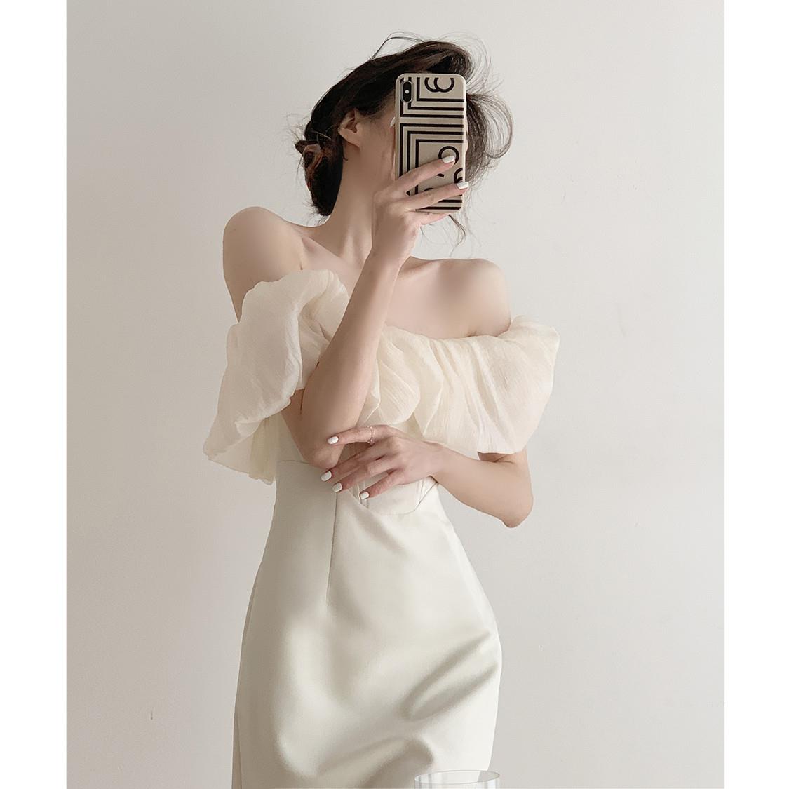 一字肩高腰中长裙