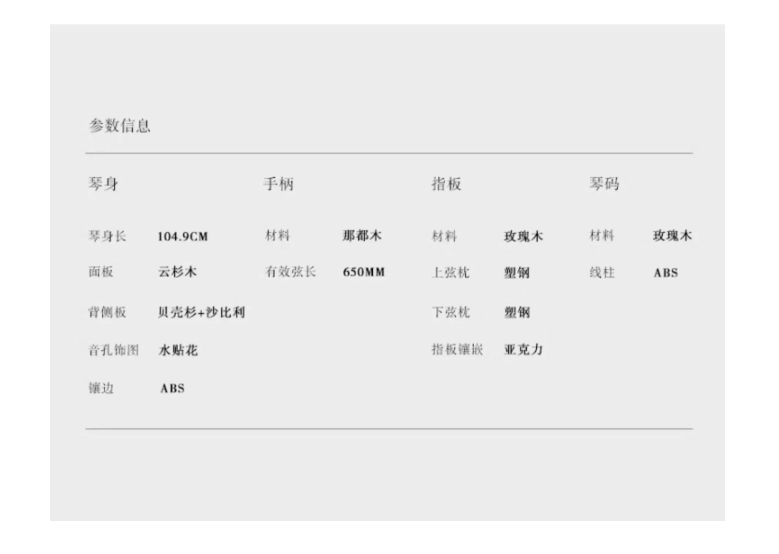 卷弦器:封闭旋钮指板材质:玫瑰木背侧板材质:沙比利