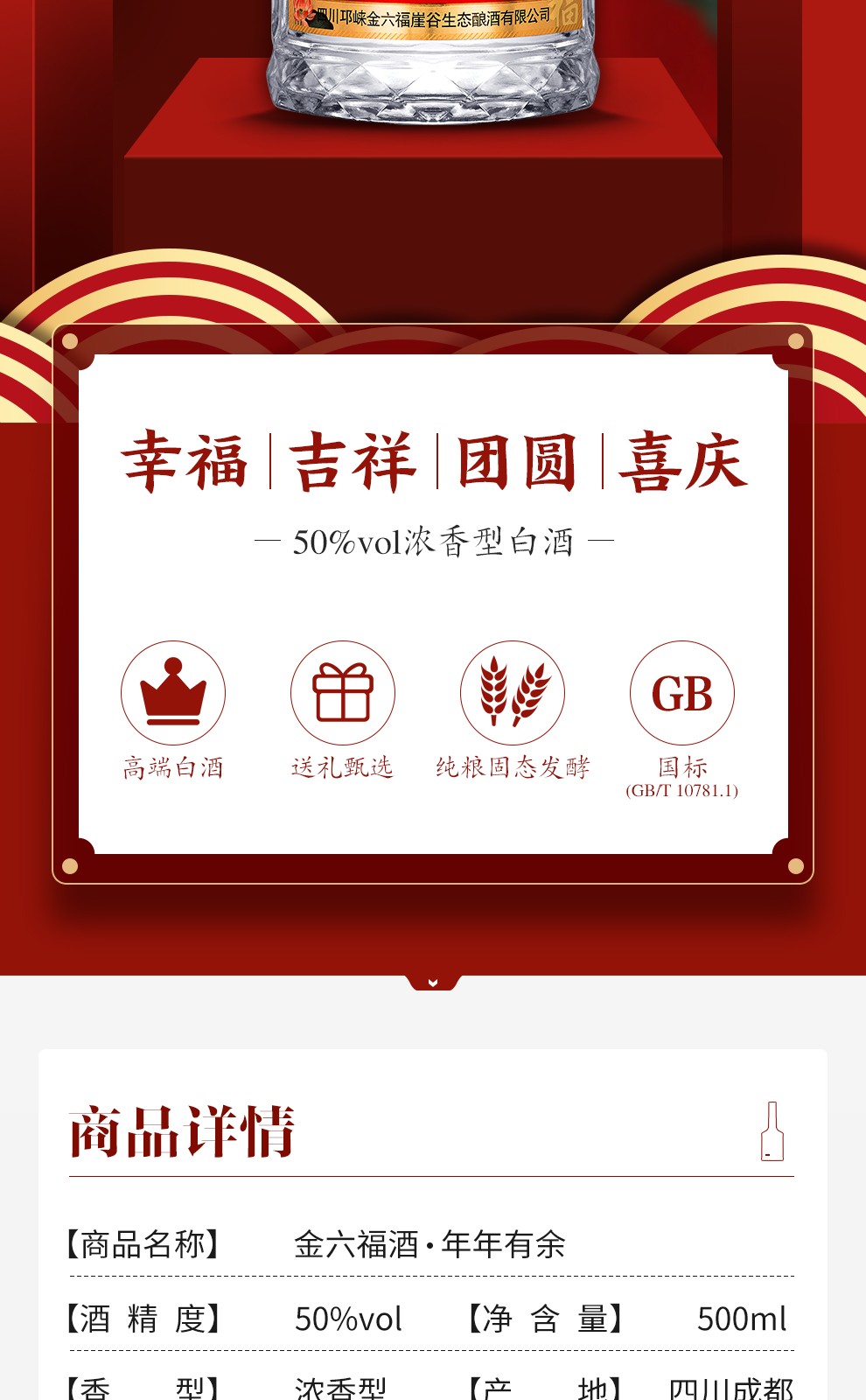 金六福酒·年年有余传承浓香之源,古法酿造,香气浓郁,口感纯正。精选优质原料酿造纯粮食酒。工艺传承古法酿造,历史沉淀的老酒香是时代的味道。延续经典,坚持人工制曲,以高粱、玉米、糯米、大米为原料,以小麦人工曲为发酵剂,辅以山间泉水精工酿制而成。