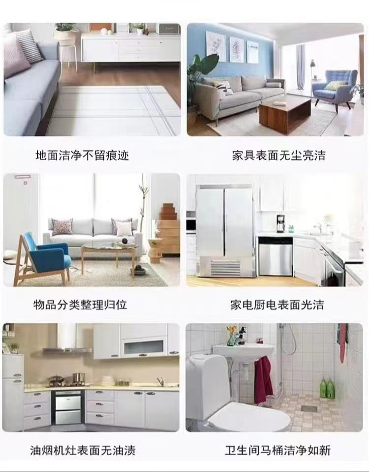 6.其他:阳台扶手、开关插座、墙面地面表面除尘房屋面积建议时长:(≤60㎡/2小时)(60~100㎡/3小时)(100~130n4小时)