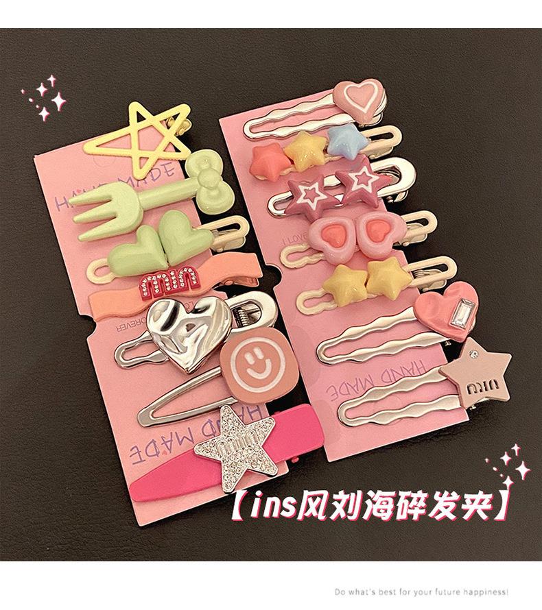 颜色1#双爱心7件套(带卡纸),2#糖果色7件套(带卡纸),3#铁铲6件套(带卡纸),4#一字夹6件套(带卡纸),5#MIN7件套(带卡纸),6#粉色大爱心6件套(带卡纸),7#五角星7件套(带卡纸),8#双C8件套(带卡纸),9#甜酷7件套(带卡纸),10#甜美7件套(带卡纸),11小众7件套(带卡纸),12冷淡7件套(带卡纸),13#清新7件套(带卡纸),14#黑色爱心7件套(带卡纸),15#粉色系7件套(带卡纸),随机拍单个发卡
