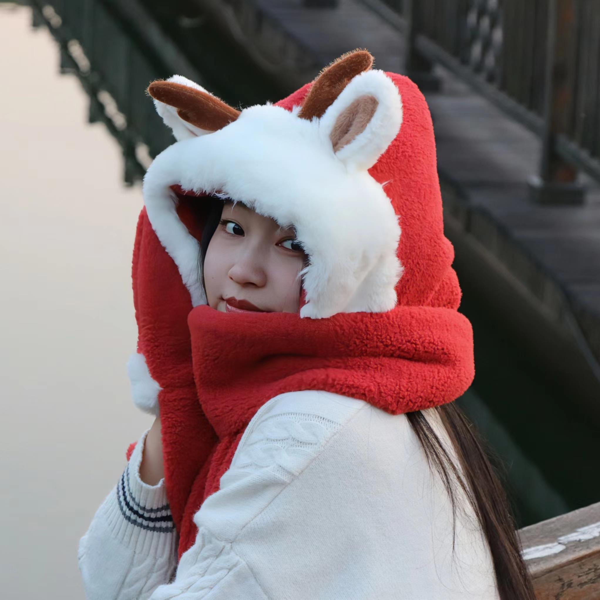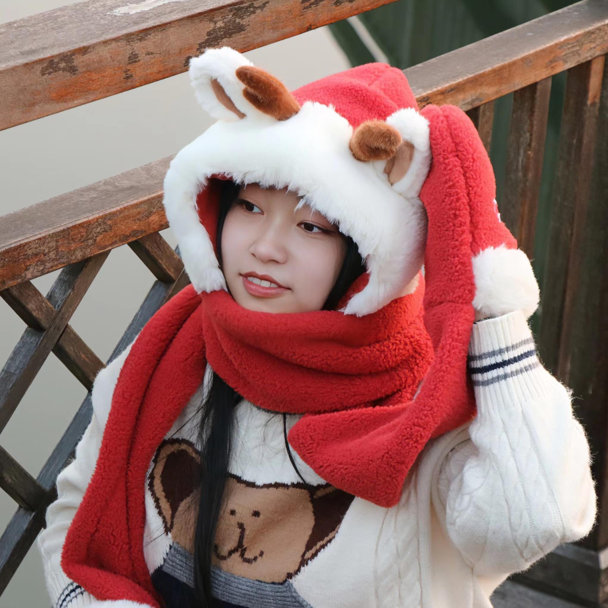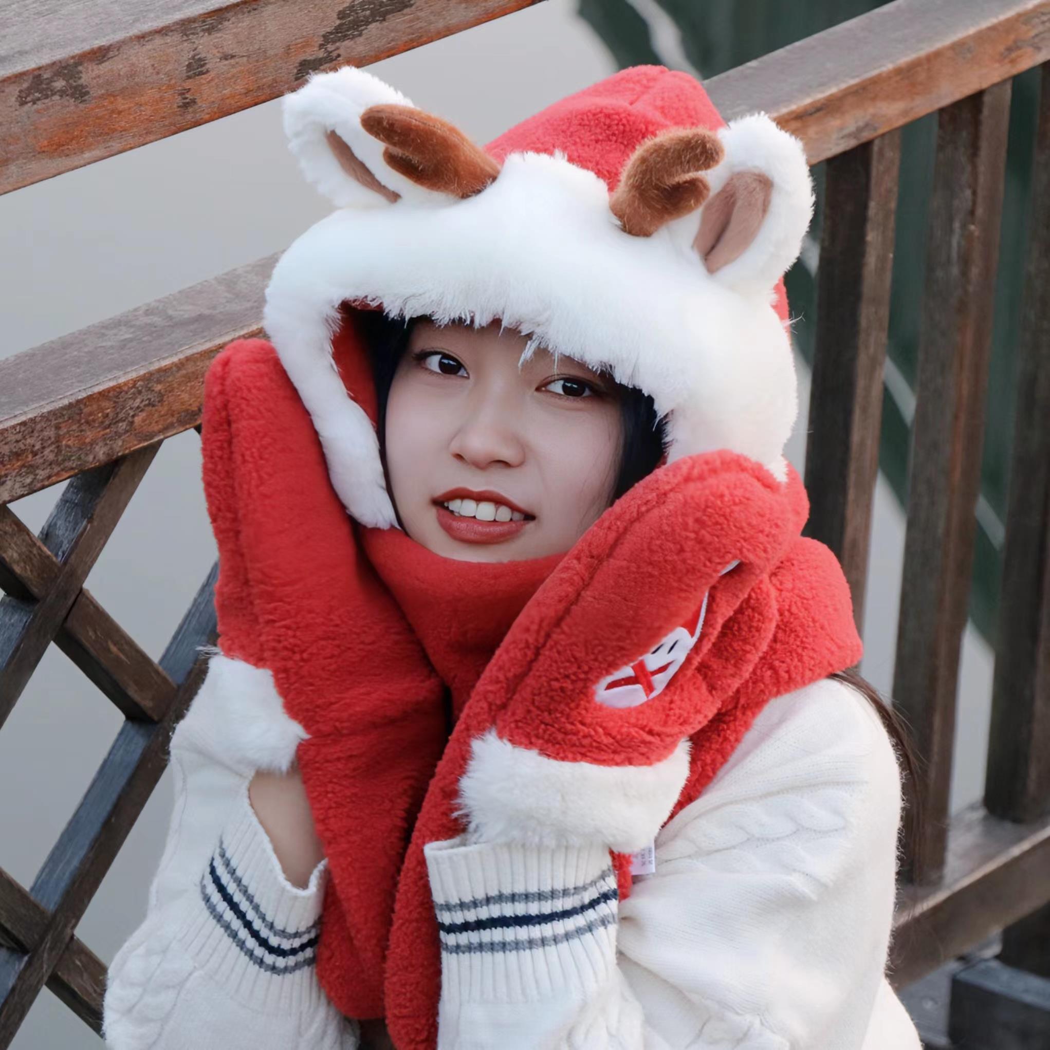 可爱圣诞礼物新年红色氛围感鹿角毛一体绒帽子围巾手套防寒护耳连体围脖