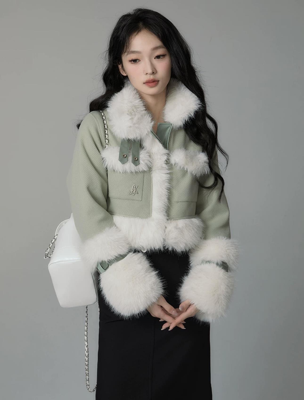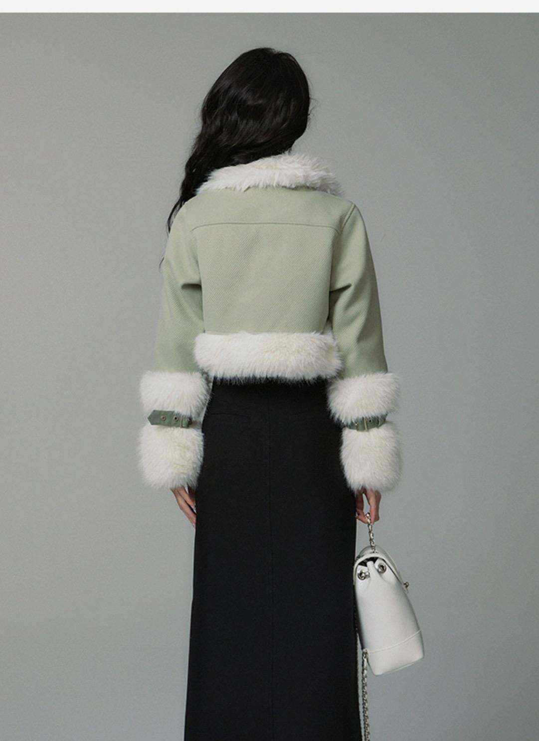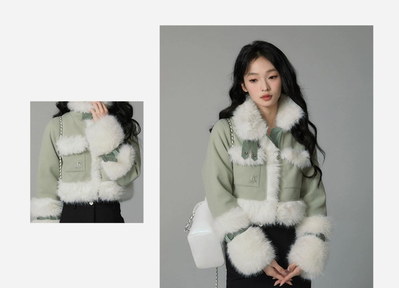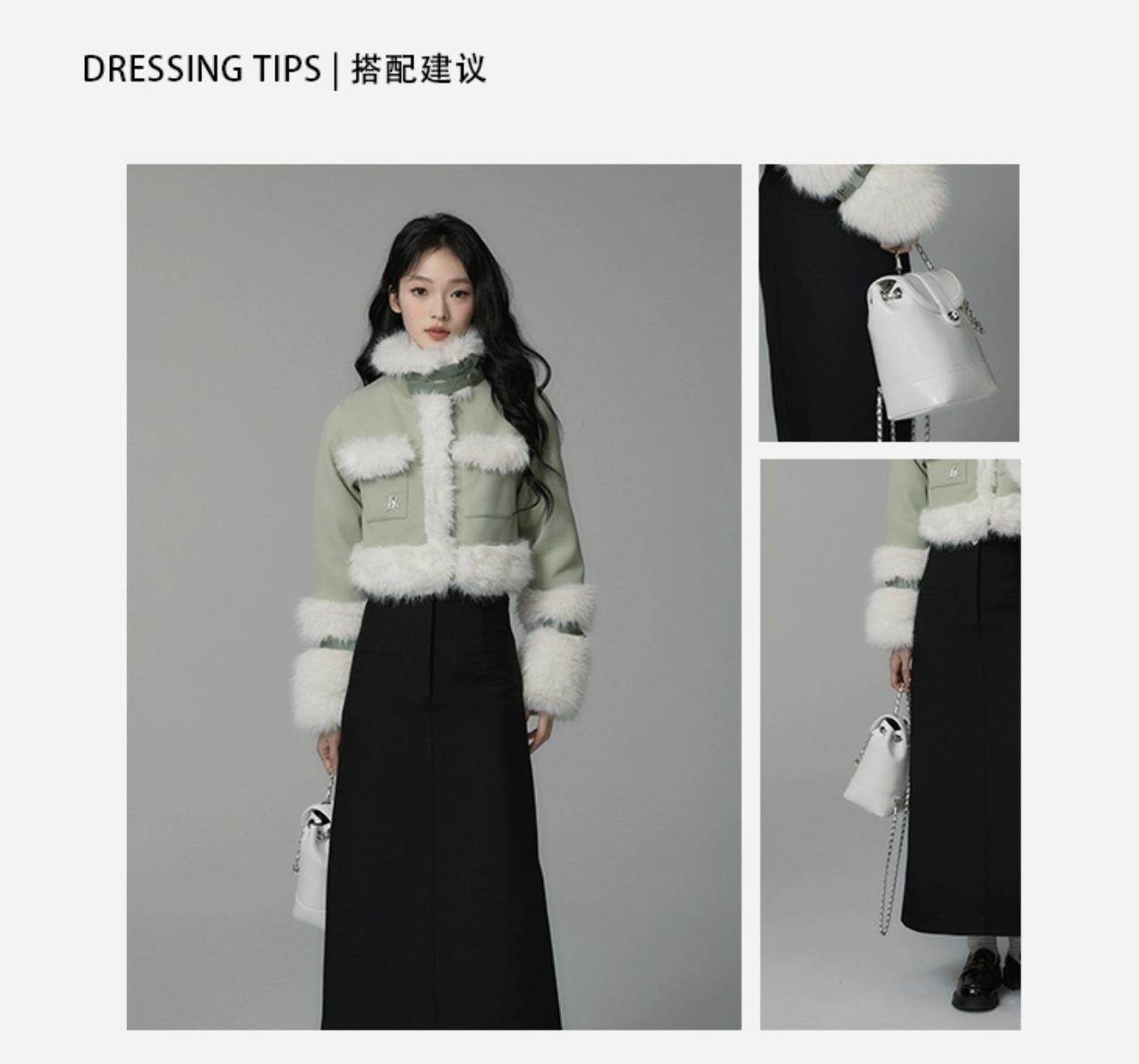 1.面料选用质感厚实的毛呢面料,表面做了斜纹组织,更加精致感,搭配上蓬松的毛,更加温暖舒适