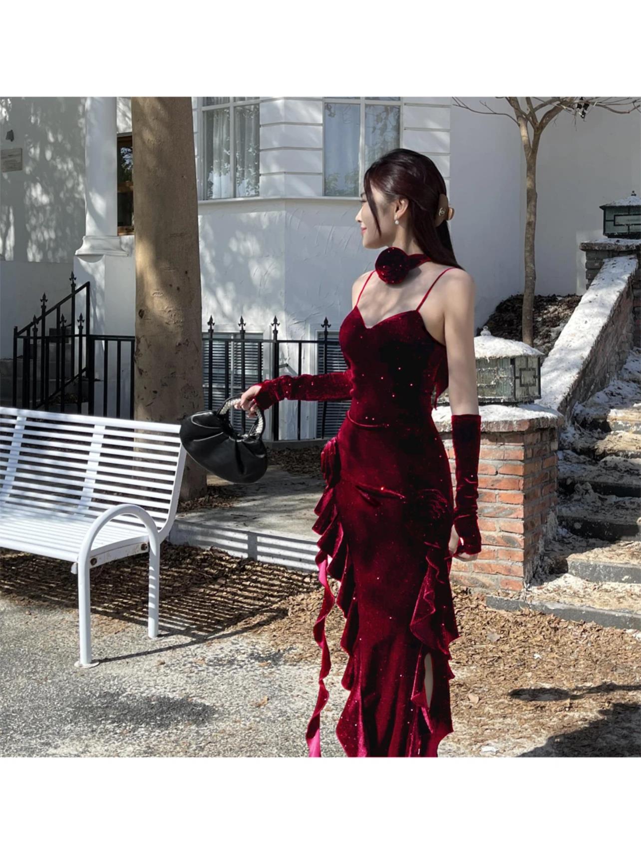 “柿柿如意”圣诞氛围丝绒吊带飘带裙气质显瘦性感包臀连衣裙+袖套