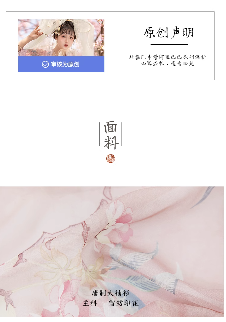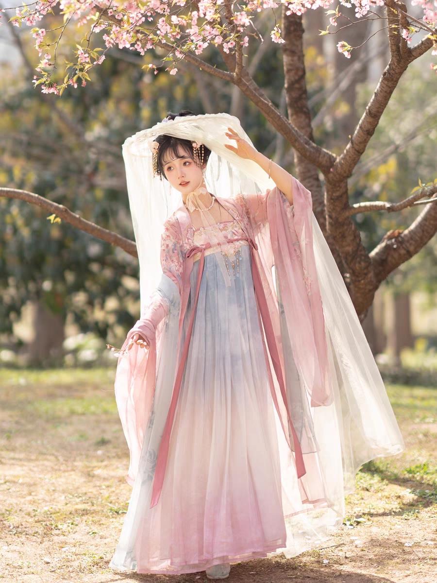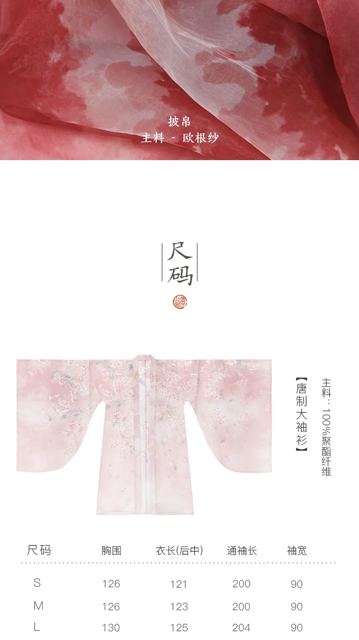 包含:印花大袖衫、齐胸裙、刺绣斗篷、披帛