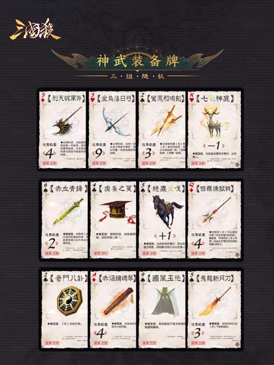 三组装备,随机一组;12神话武将;大量武将技能调整,更适配线下对决