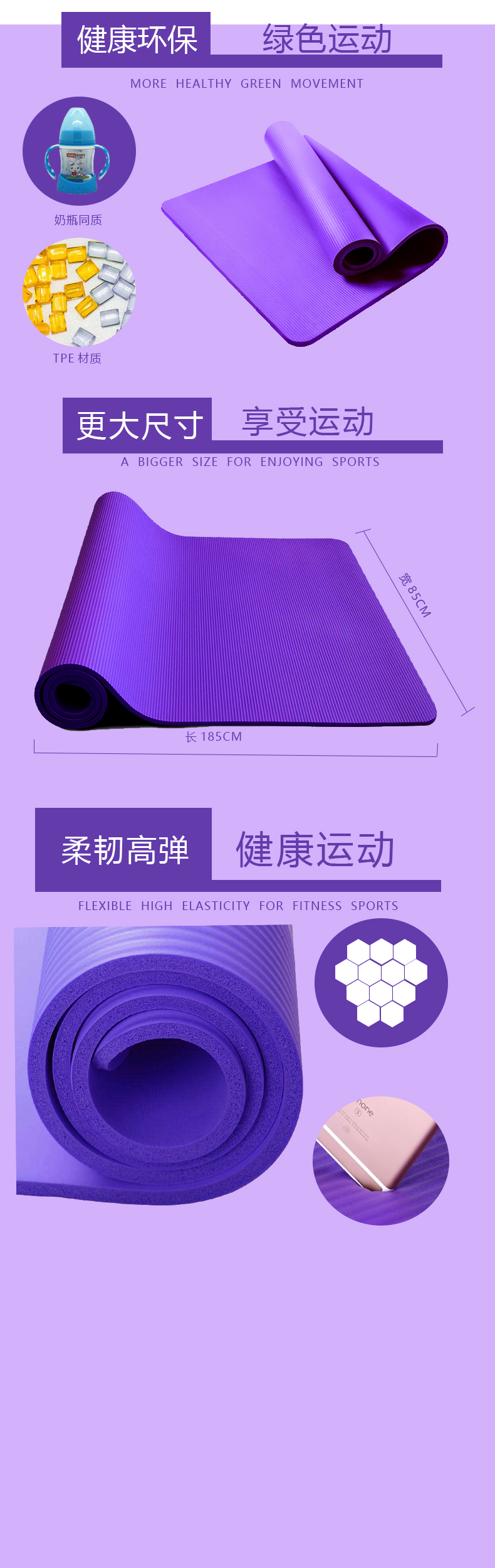 瑜伽垫表面颗粒均匀,气泡饱满,手感柔软,且无毒、无味、防滑、回弹能力强,具有很强的抗撕拉能力,是瑜伽练习者的理想选择。此外,瑜伽垫还能有效阻隔地面寒气,抓地力强,具有突出的人体皮肤亲和性。