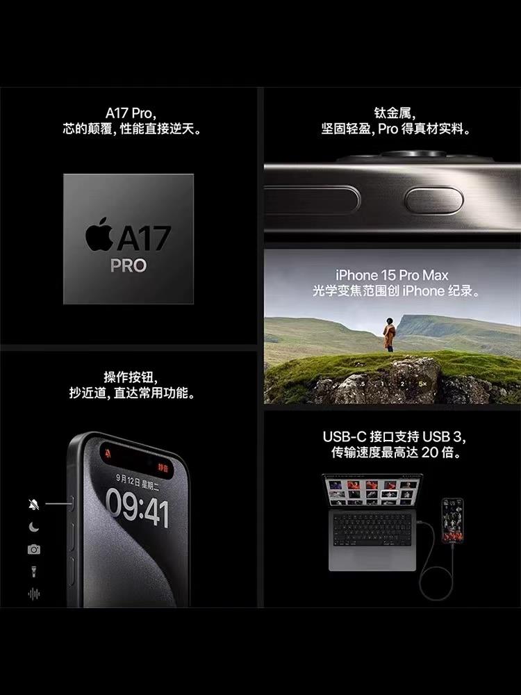 iPhone15proMax金属钛白色256g.搭载了6.7英寸OLED材质屏幕,分辨率2796*1290,像素密度460PPI,刷新率为120Hz,屏幕最高亮度力1000nits,支持超视网膜XDR和P.3广色域,长度159.9毫米,宽度约76.7毫米,厚度约8.25毫米,重量约240克。采用了全新的A17pro芯片,基于3nm工艺制程,拥有160亿晶体管,CPU性能提升40%,功耗降低了20%。还配备了8GB运行内存,4422mAh电池,支持35W有线和20W无线快充,摄像头包括后置4800万像素主摄、1200万像素超广角摄像头集一身的手机。