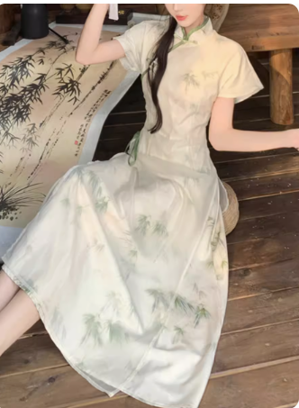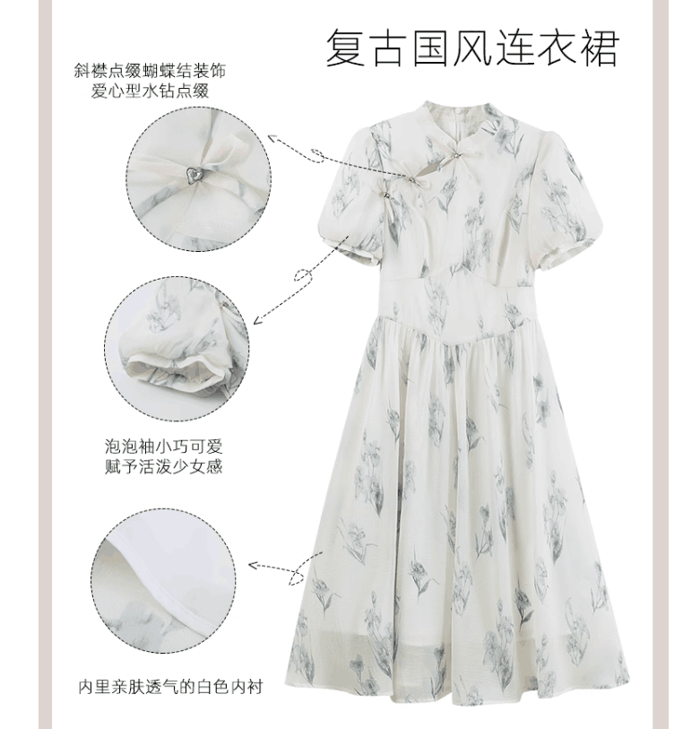 流行元素/工艺:泡泡袖,蝴蝶结,印花款式:中式连衣裙廓形:A型