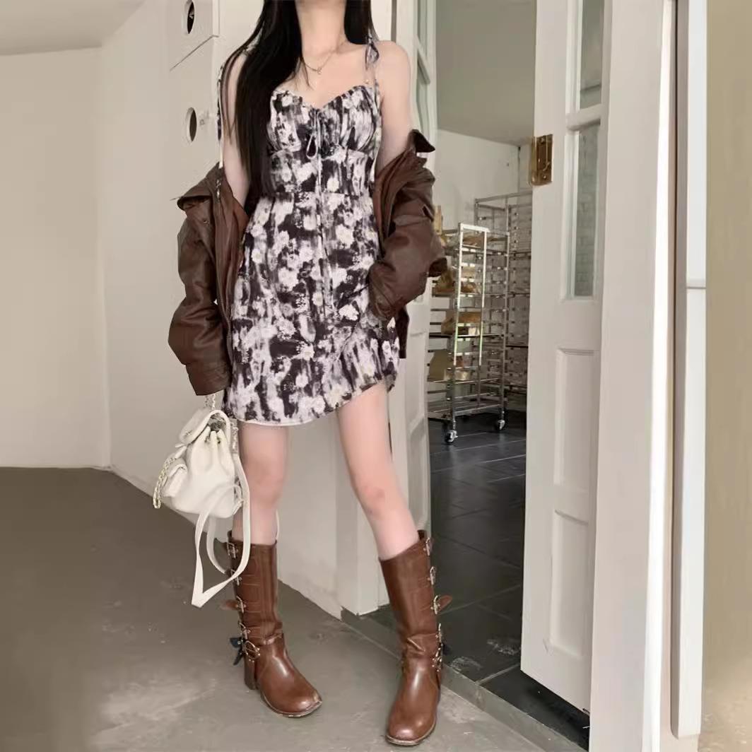 甜辣风碎花吊带连衣裙女夏季气质系带收腰气质裙子a字裙
