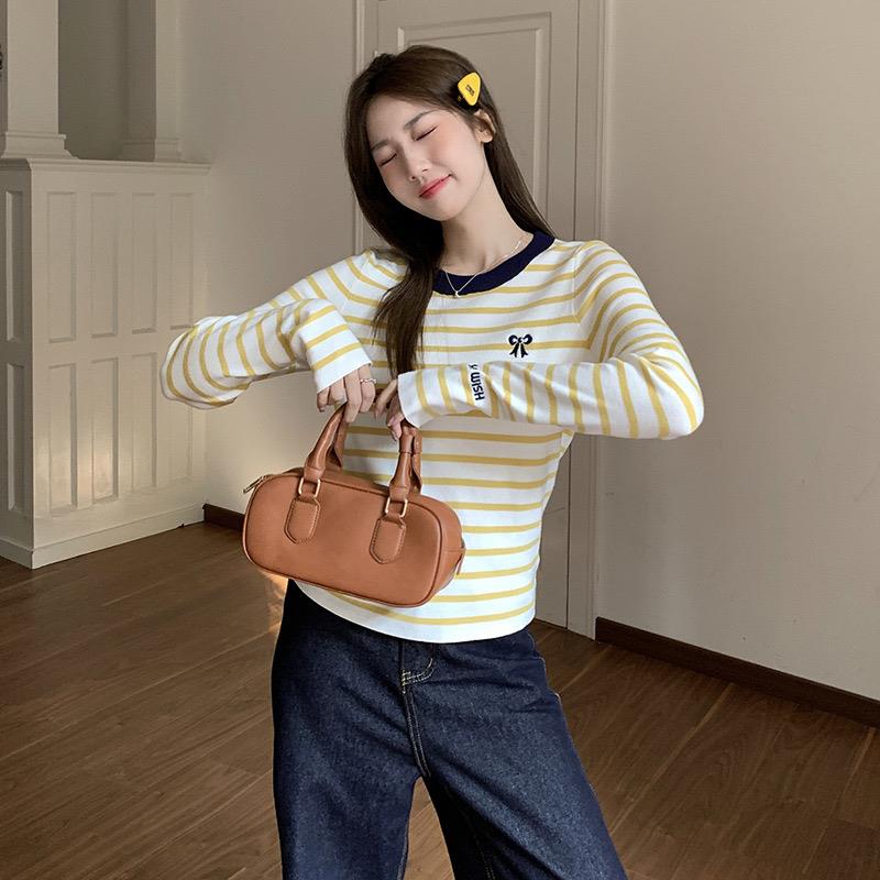 黄色条纹圆领印花针织打底衫长袖女秋冬正肩内搭设计感小个子上衣