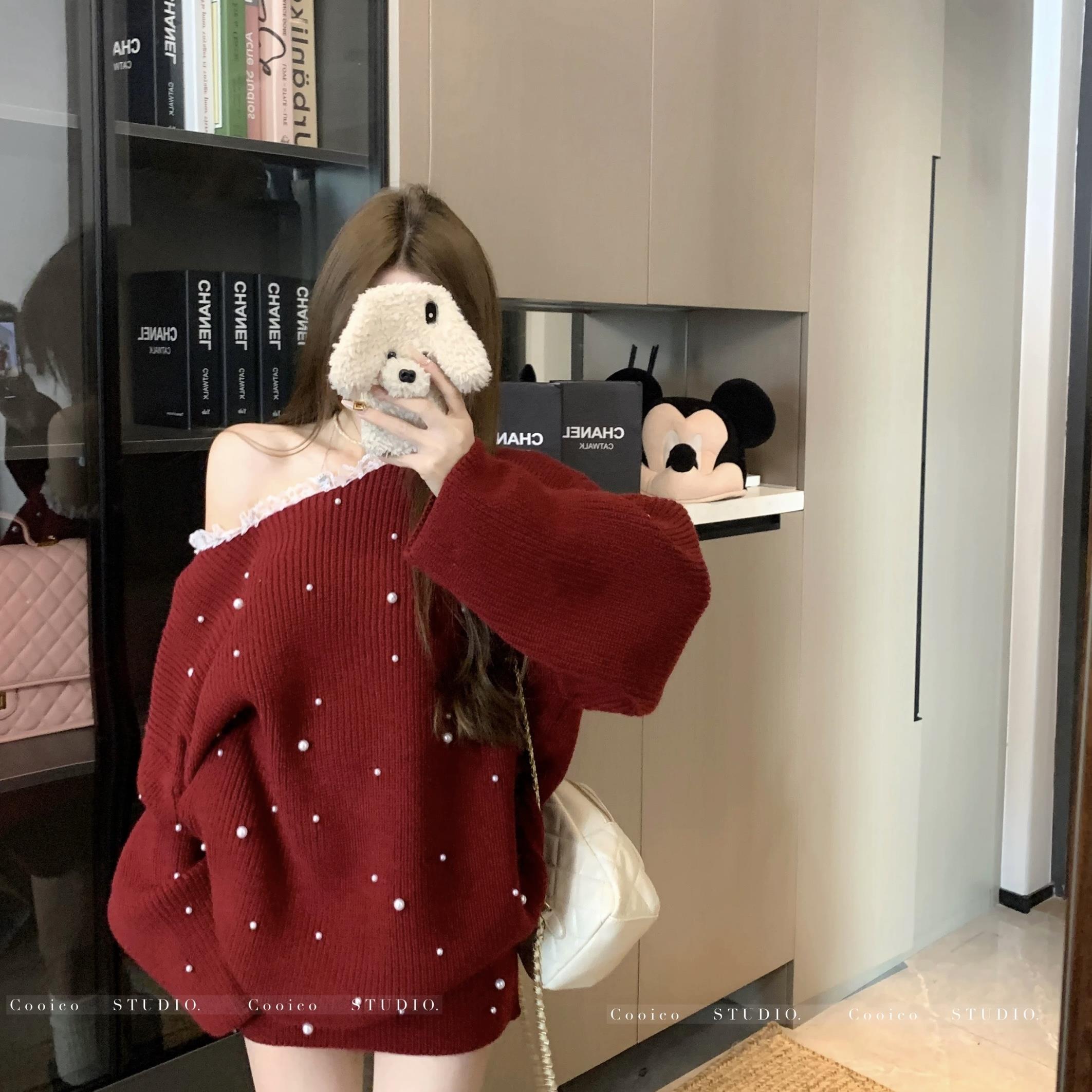 过年穿搭套装复古红色钉珠斜肩毛衣女冬季针织包臀半身短裙两件套
