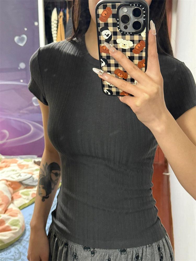 动漫周边 > 服饰 > QFD-肌理感正肩短袖T恤女夏季2024新款修身显瘦短款小个子上衣ins
