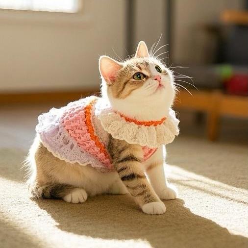铲屎官们看过来!这款手工编织猫咪小背心,粉紫配色温柔甜美,精致花边增添俏皮感,胸前还有可爱图案,时尚度拉满。材质柔软舒适,不束缚猫咪活动。给毛孩子穿上,既保暖又吸睛,不管是日常玩耍还是拍照打卡,都能让它成为焦点,轻松收获无数赞美 !